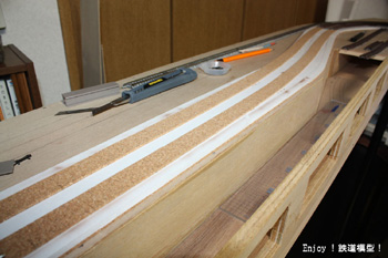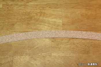 仮設置したフレキシブルレールの位置をマーカーし、いったん取り外します。幅20mmに切り出したコルクシートをマーカーした位置に木工用ボンドで貼り付けます。カーブに順応するために、コルクシートは両側から等間隔に切り込みを入れておきます。