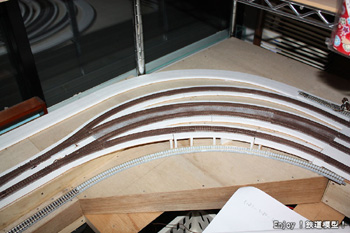 今日の作業で、単線ループもポップコーアのベースの敷設が完了し、次回からは線路の敷設作業に移ります。 |