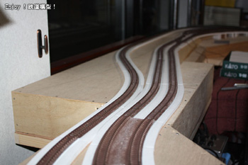 ポップコーアとコルクシートで作成した単線(貨物線)の線路路盤ができましたので、一昨日線路の準備を行い、本日線路の固定を行いました。