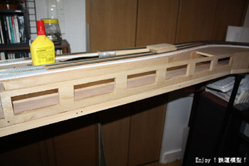 レールの固定は、レールを配置したあとに、問題がなければ釘で仮固定し、線路の両側に木工用ボンドをシーラーの如く塗布します。木工用ボンドが乾いたら、釘は取り外しておきます。