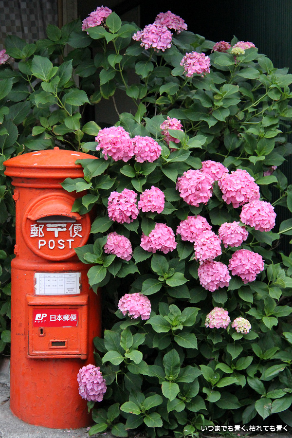 鎌倉坂ノ下にある和菓子の老舗、力餅家にある「あじさいポスト」の写真です。ピンクの紫陽花と赤い郵便ポストが良く似合います。訪れたのが18:30という時刻でしたので、お店はすでに閉店後でした。