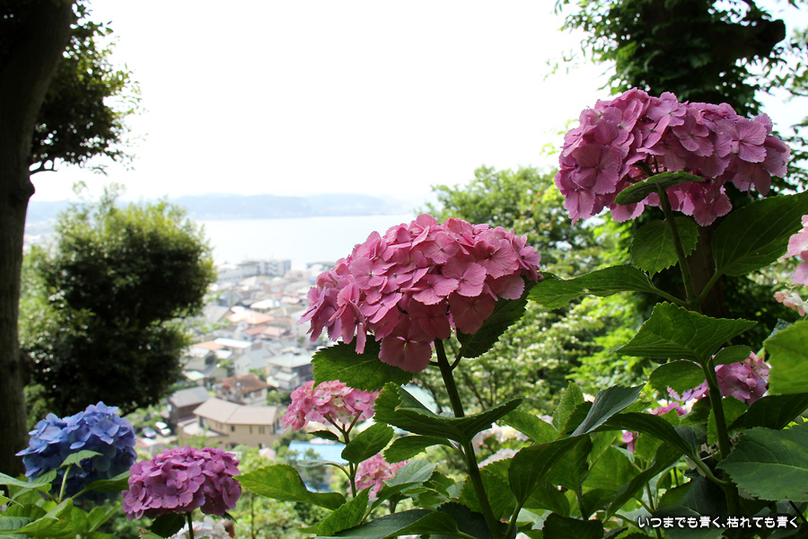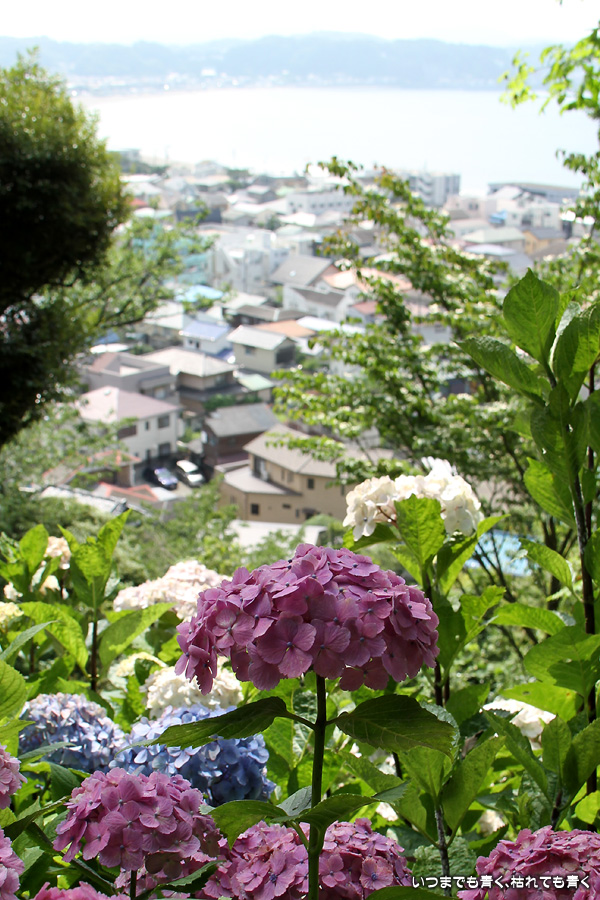 この時期の長谷寺の眺望散策路は、訪れる人が多く平日でも昼前には入場制限がかかってしまいます。制限なくゆったりと楽しむために、奥さんとホテルで早めの朝食をとり、横須賀線と江ノ電を乗り継ぎ、朝一番で訪れました。そのおかげで、人の入らない写真や、距離を置いての撮影も可能でした。今年の長谷寺眺望散策路の紫陽花は、数も多くて見ごろの美しい紫陽花が多く、由比ガ浜もきれいに見えましたし、私が来るようになってから一番の満足度でした。奥さんは、長谷寺の紫陽花は初めてでしたが、部晴らしいと感激して楽しんでいました。