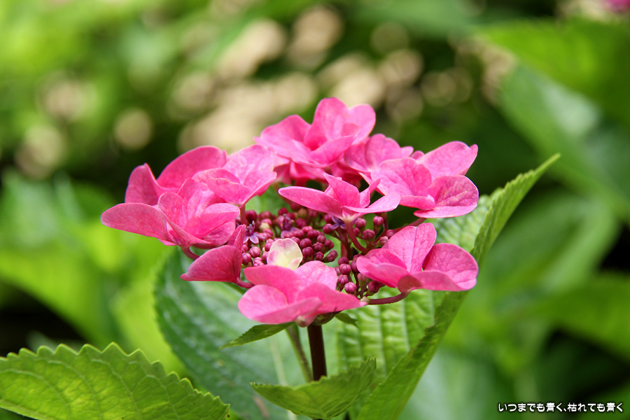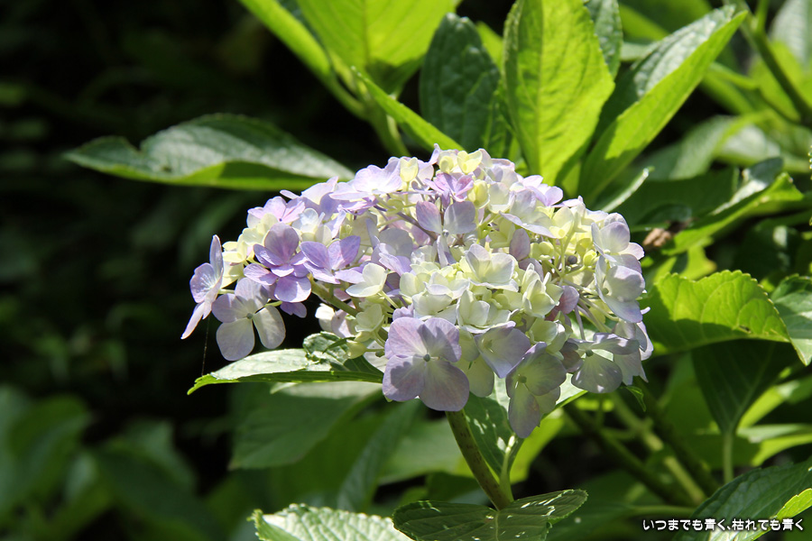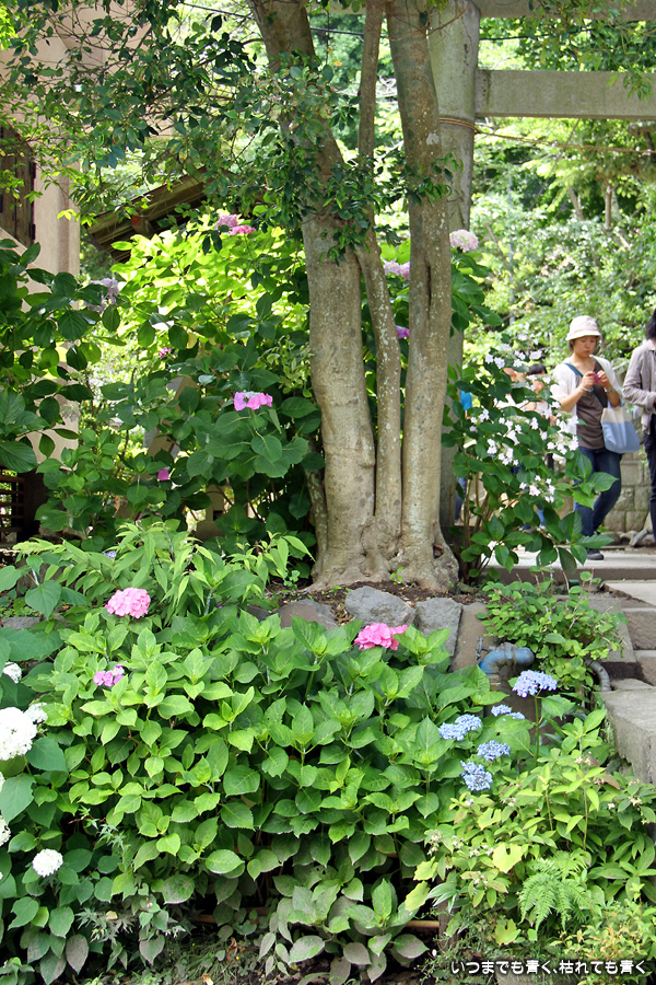 長谷寺の紫陽花を見たあとは、必ず御霊神社の境内を通って神社前の江ノ電の踏切で江ノ電の撮影を行いますが、御霊神社にも紫陽花の小道があって本堂のまわりの紫陽花ををぐるりと一周楽しめます。今年はちょっと数が少ないようで寂しい感じがしました。ここには八丈千鳥という6月と10月に咲く紫陽花があります。
