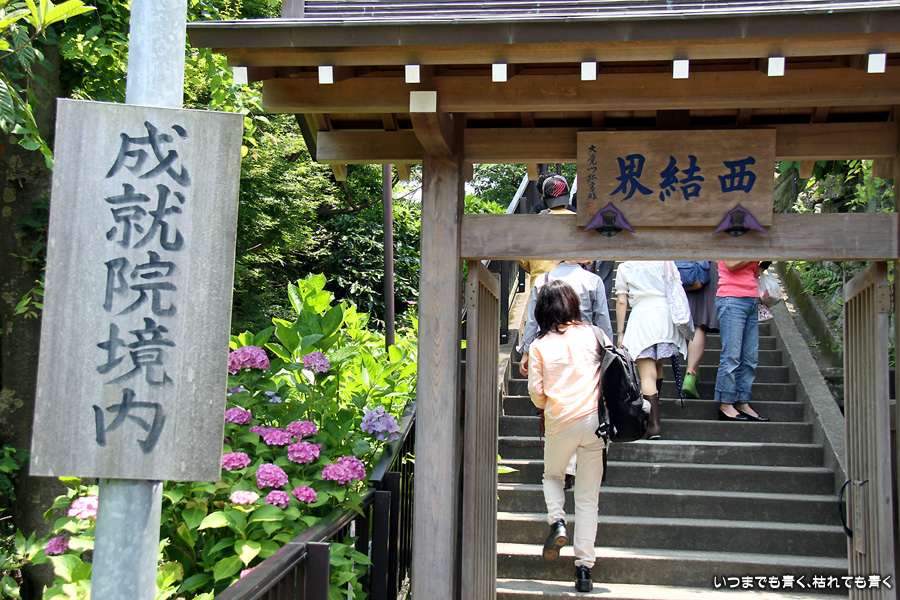 成就院の石段の参道の両側に咲く多くの紫陽花を見ながら望む由比ガ浜の景色はとても素晴らしい景色です。曇り空で海岸が少し霞んでいるのが残念でしたが、ここの紫陽花はちょうと見頃で美しく、見に来て良かったと思います。
