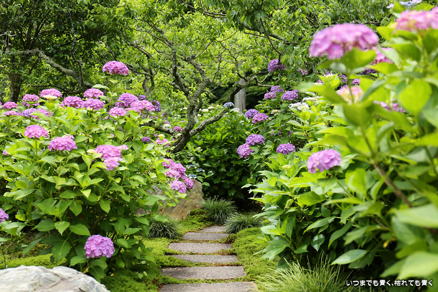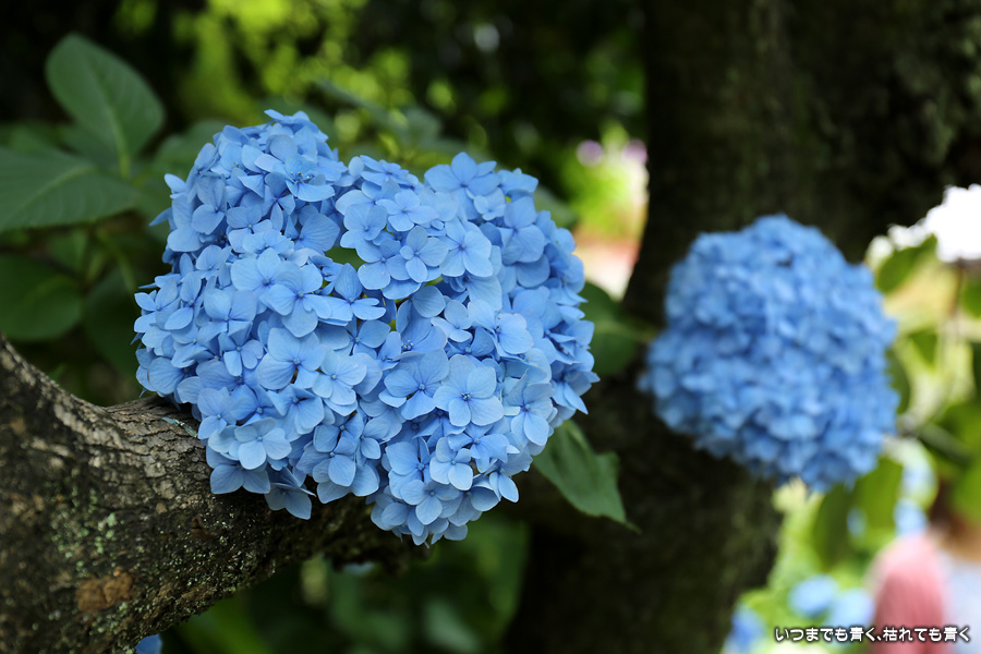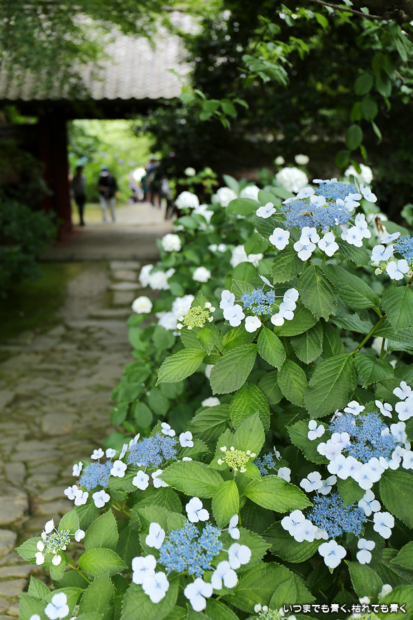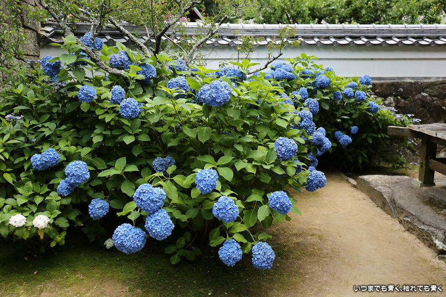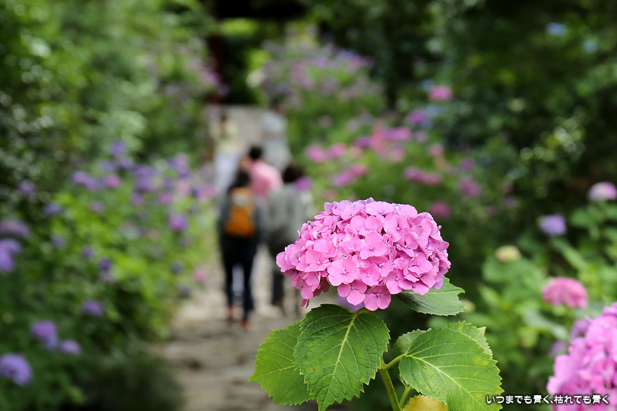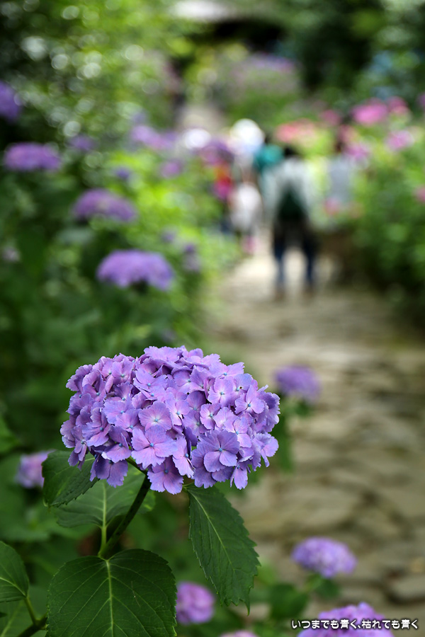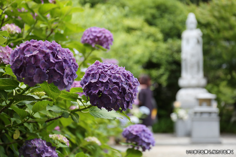 三河のあじさい寺、瑞雲山本光寺の紫陽花を家族で見に来ました。このお寺に紫陽花を見に来たのは今年で5回目(2010年、2011年、2012年、2014年、2016年)ですが、今日は、その5回の中で一番きれいではないかと思えるほど、花の状態が良かったです。すべての花が咲き始めたばかりの美しさで、目立つ傷みも全くありませんでした。そういう見ごろ最良日のせいか、私たちが帰る頃には駐車場に向かう道にクルマの行列ができるほどの人の多さでした。写真を撮る人も多くて、撮ろうとする構図の中からなかなか出てくれないのはお互い様で仕方がありませんが、あじさいの花の前でずっと三脚を置いたままにしていたり、カメラ談義を長々とするのだけはご勘弁といった感じでした。