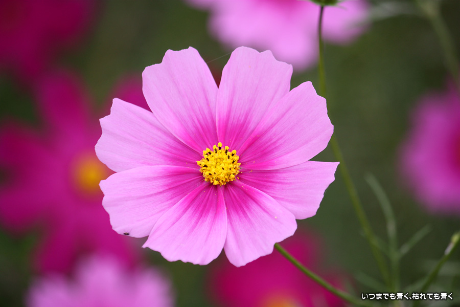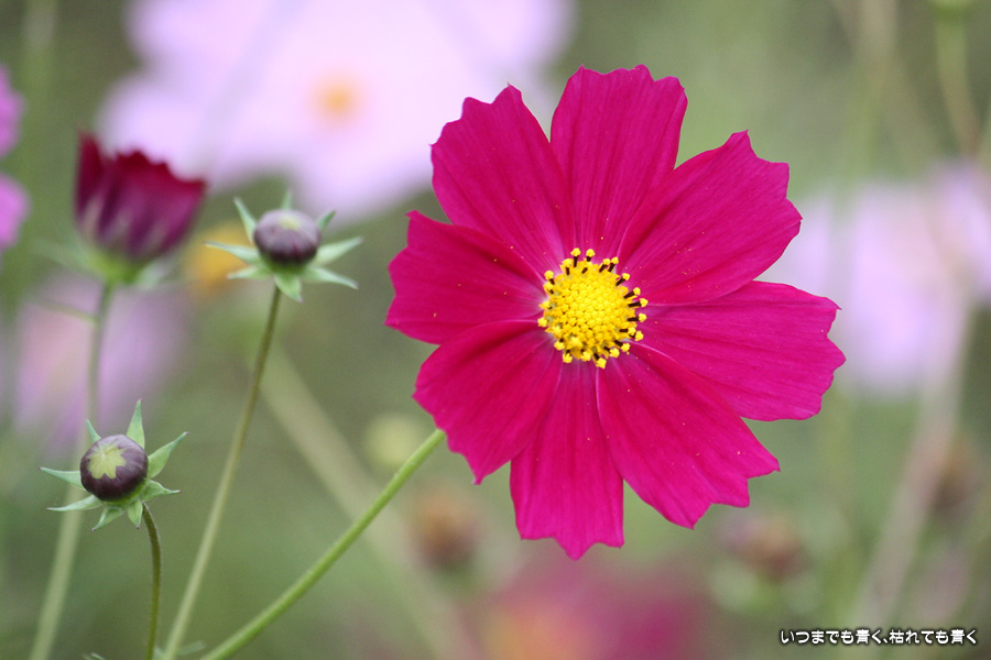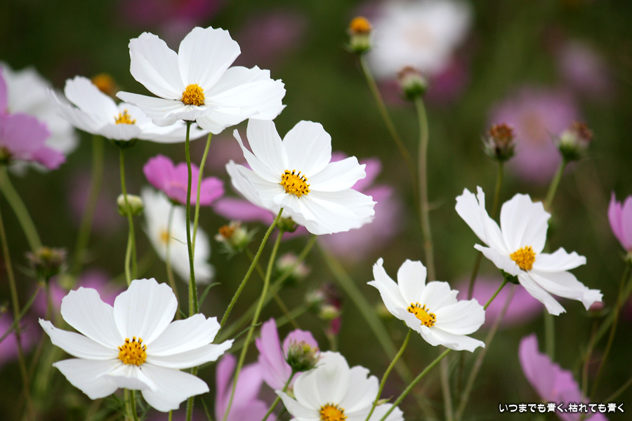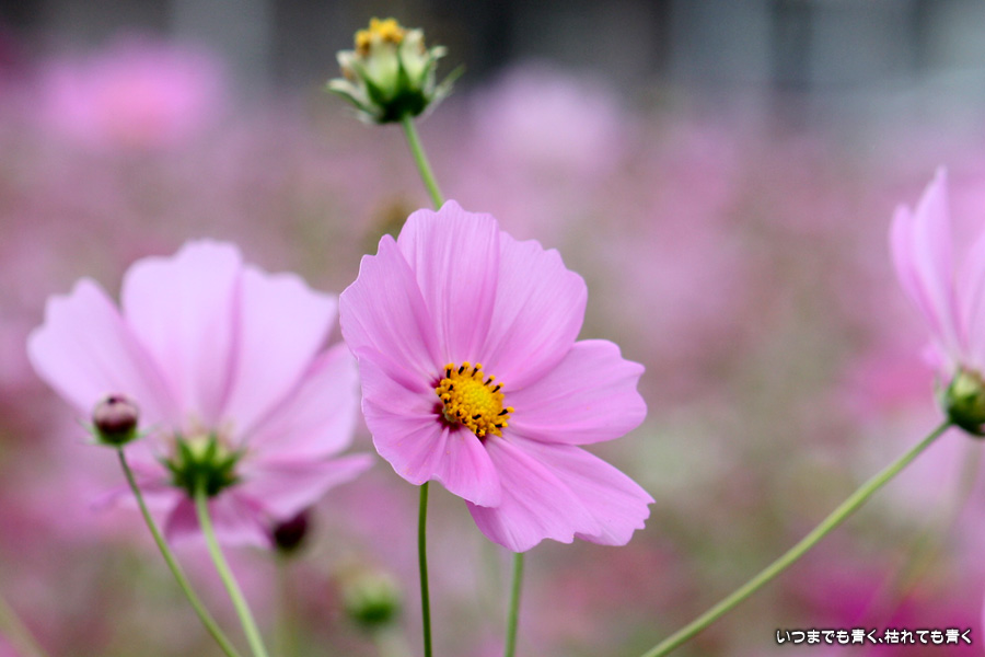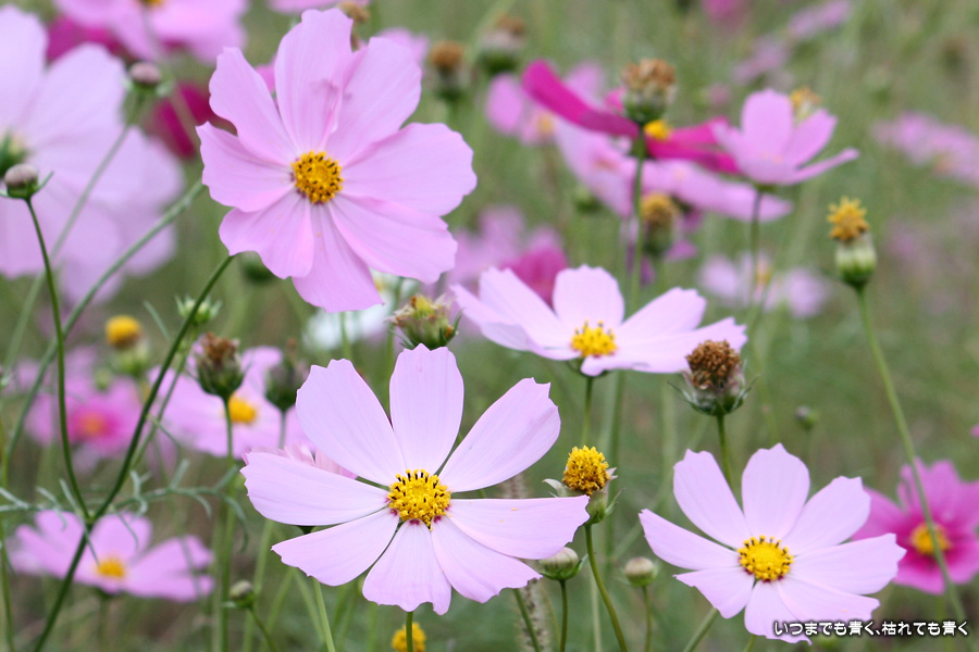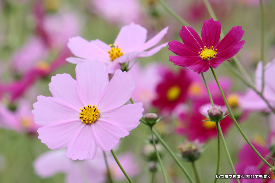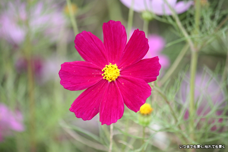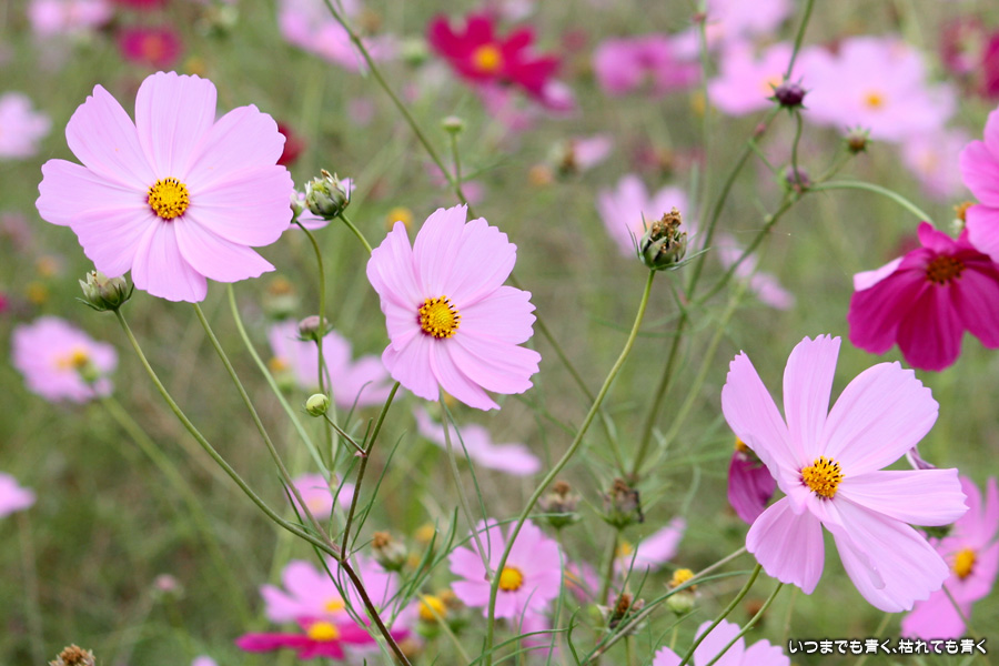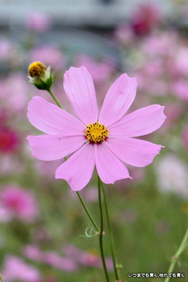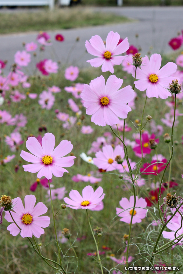 今日、カメラを片手に近くのコスモス畑2ヶ所に行ってきました。たまに小さな子供連れの家族がやってきて、コスモスをバックに写真を撮ったりしています。私も頼まれて写真を撮ってあげました。あらためてコスモスの花をよく見ると、色だけではなく形も微妙に違っていているのですね。コスモスという花にあまり興味もなく、漠然とコスモスをいう花をとらえていたように思います。コスモスをこんなにじっくりと見たのは、生まれて初めてかも知れません。四季の花をこうして楽しんで季節を感じながら時を過ごす楽しみ。老け込むのは嫌ですが、こういう楽しみを感じる事ができるようになったのは、やはり年齢なのでしょうね。そのうちに、あと何回見ることができるかなぁ、なんて思うのでしょうかね・・・。