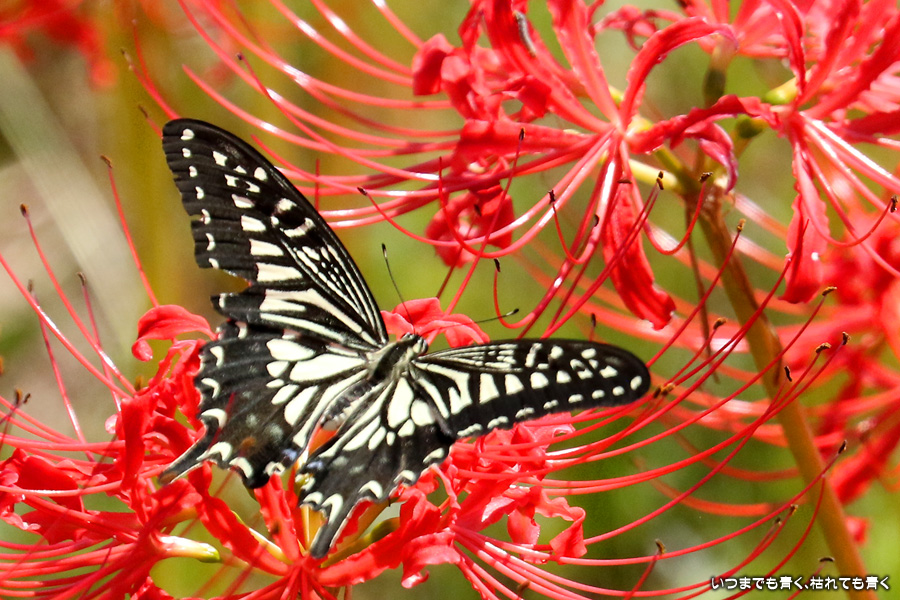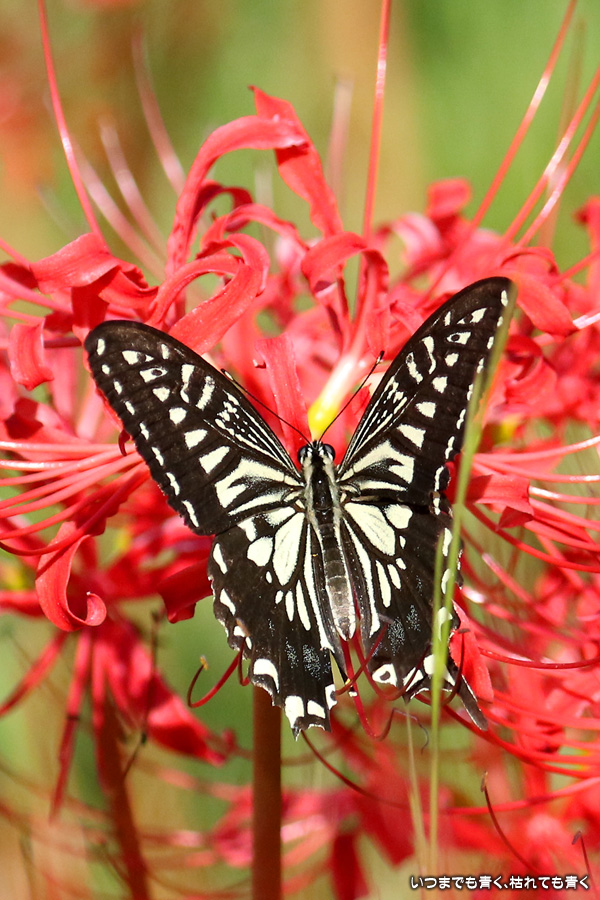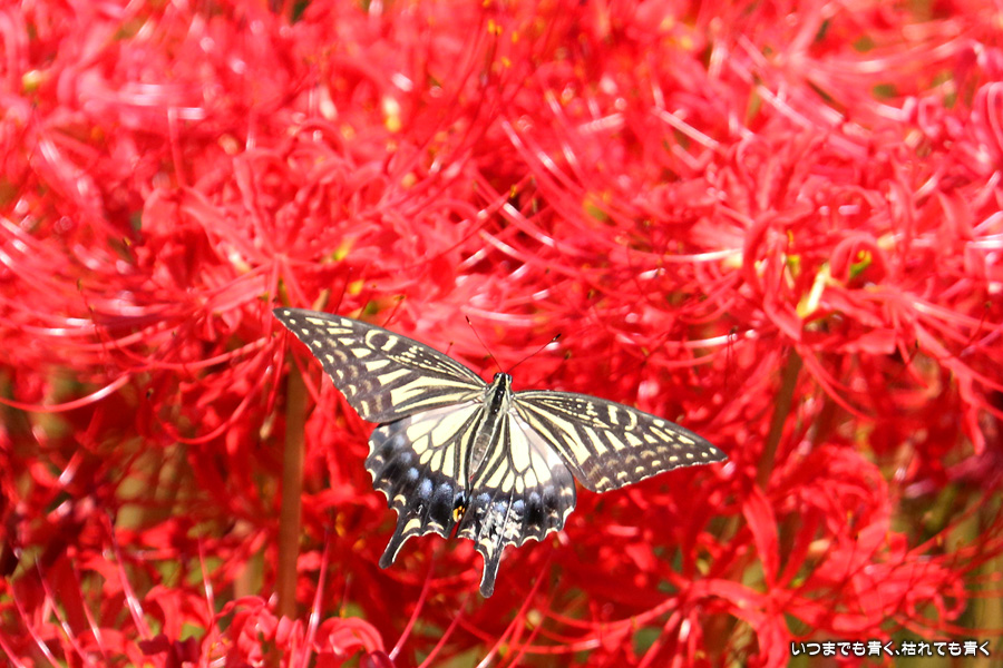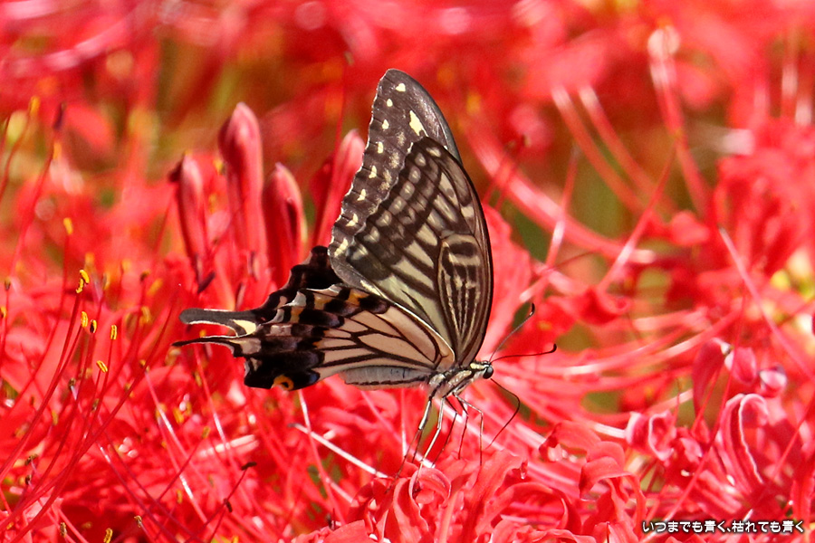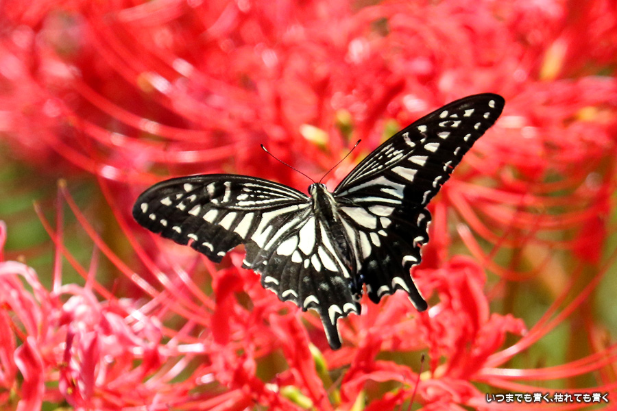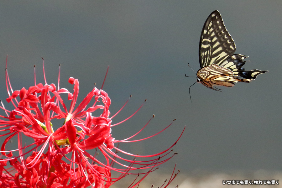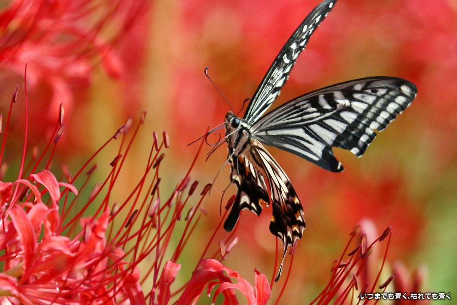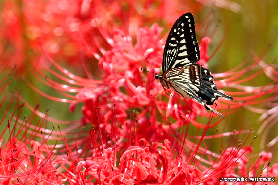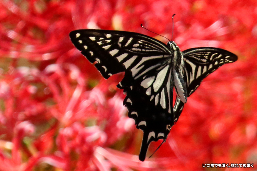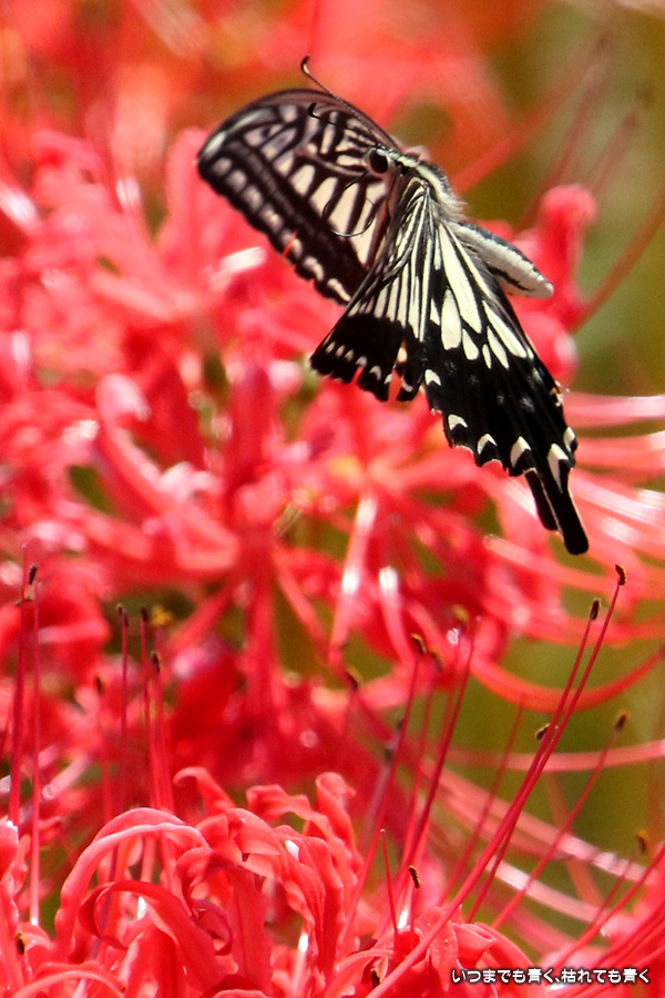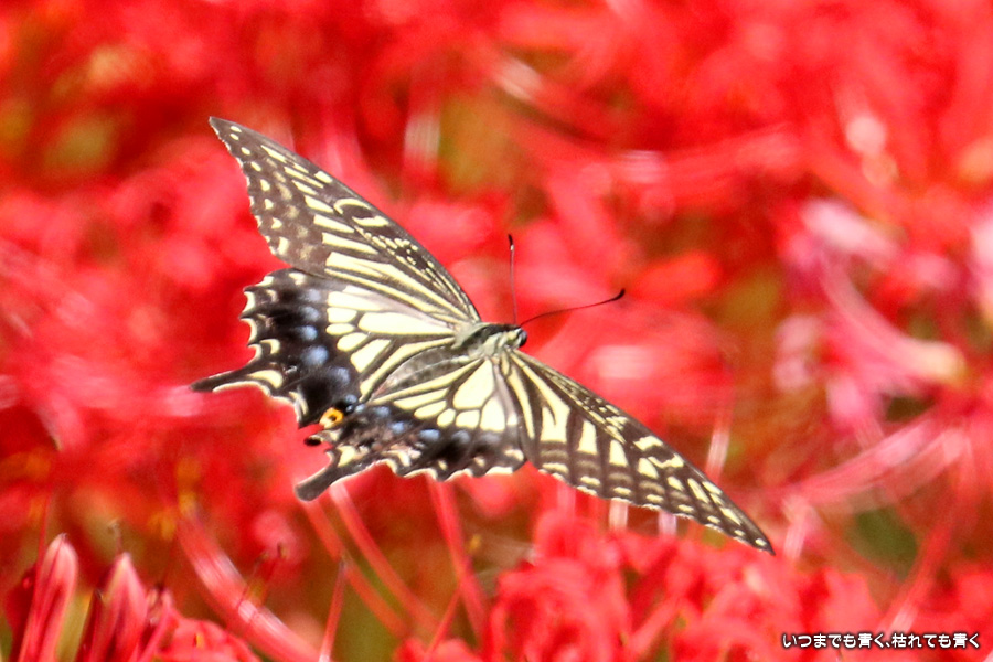 彼岸花の撮影でのもうひとつの楽しみはアゲハ蝶の撮影です。この日もアゲハ蝶が彼岸花の上を舞っていましたので、望遠レンズを向けて撮影を楽しみました。今回は、花に止まるアゲハ蝶だけではなく、舞っている姿を写真に撮ろうと頑張りましたが、空中をかなりの速さでフラリフラリと舞うので、ピントがそれなりに合って鑑賞に堪えうる写真はそう多くはありませんでした。しかし、たまたま良い写真が撮れると嬉しくなるので、こういう撮影は面白いです。