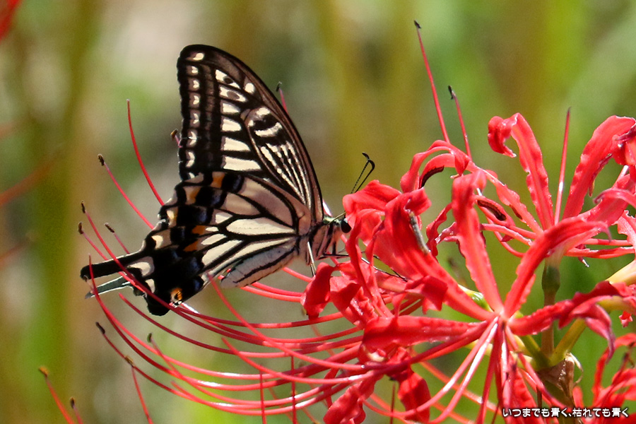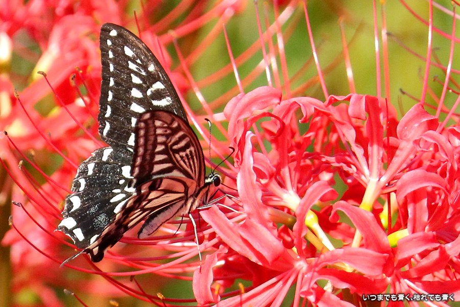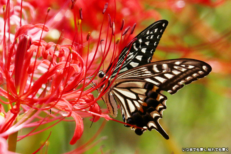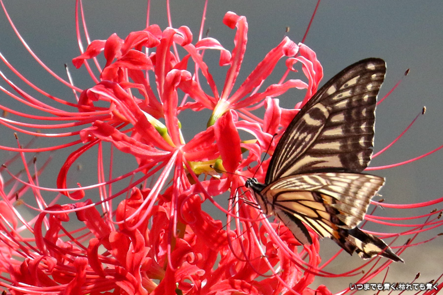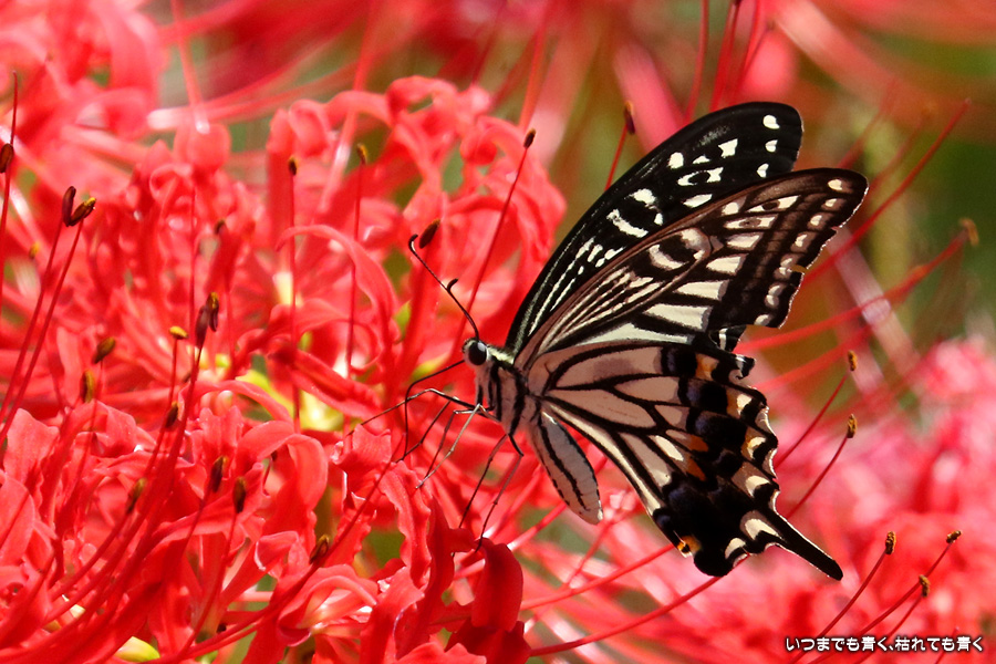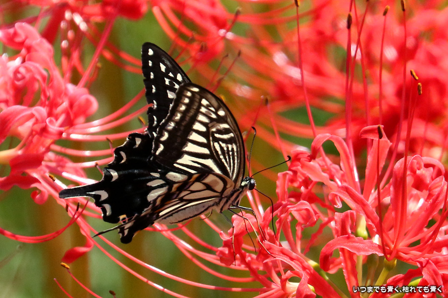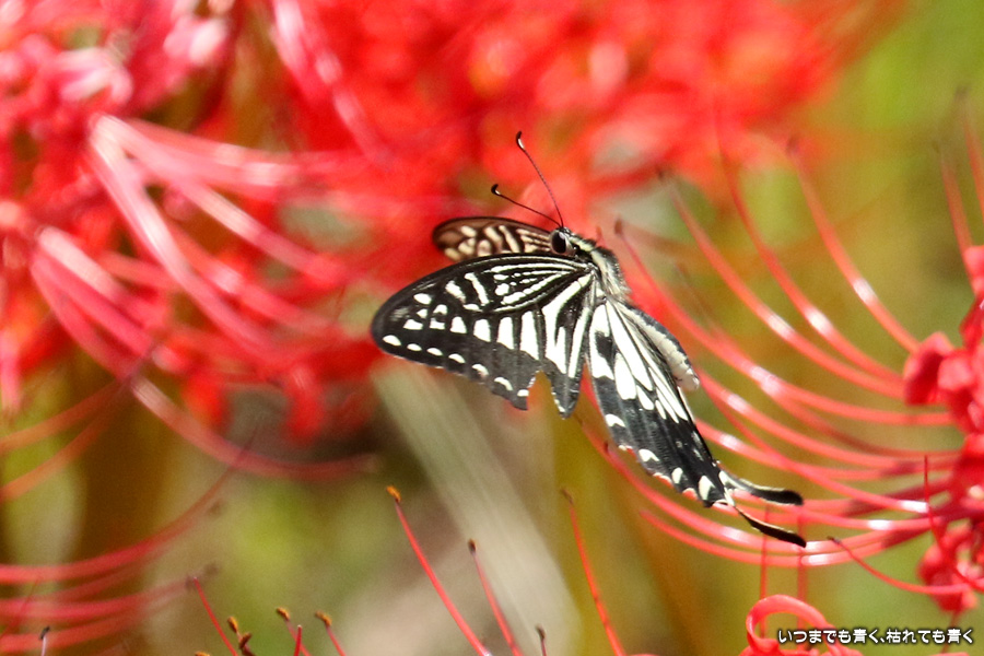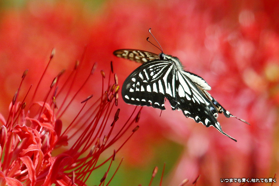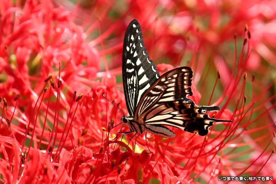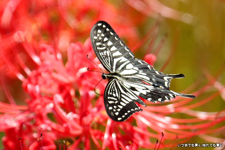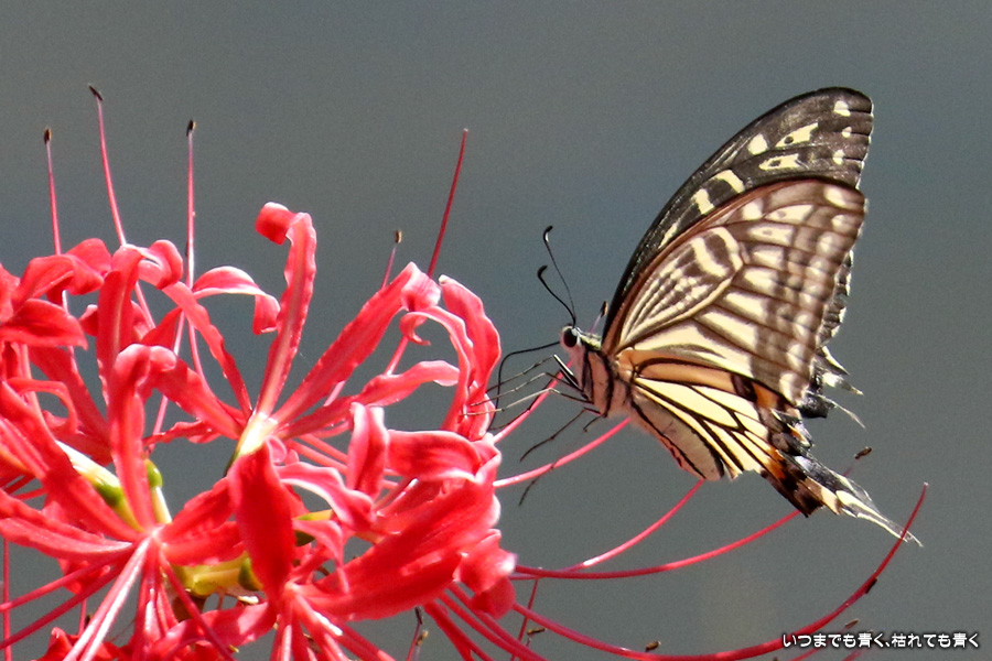 彼岸花の撮影でのもうひとつの楽しみはアゲハ蝶の撮影です。この日もアゲハ蝶が彼岸花の上を舞っていましたので、望遠レンズを向けて撮影を楽しみました。今回は、花に止まるアゲハ蝶だけではなく、舞っている姿を写真に撮ろうと頑張りましたが、空中をかなりの速さでフラリフラリと舞うので、ピントがそれなりに合って鑑賞に堪えうる写真はそう多くはありませんでした。しかし、たまたま良い写真が撮れると嬉しくなるので、こういう撮影は面白いです。