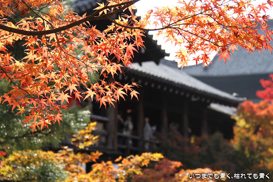 冬の京都、春の京都は何度か行きましたが、今年は秋の京都を楽しみたいとずっと思っていました。予定では、来週あたりが紅葉の見頃かなと思っていたのですが、インターネットで東山のモミジは見頃になっていると出ていたので、急遽、家族で出かけてきました。最初の東福寺は、「京の秋、モミジの通天橋」と言われるように、通天橋からの眺めと、通天橋とモミジの構図がとても素晴らしいところです。ここは過去にも何度か訪れたことがありますが、通天橋の拝観券を買うのに長い行列ができているのはこの時期ならではの光景でした。 真っ赤な紅葉の中の通天橋を期待して楽しみにしていたのですが、中に入るとまだ緑の葉も多くてやはり少し早かったようで、少しがっかりというのが正直な感想でした。それと、人がいっぱいで通天橋や下の庭園は歩くのがやっとという感じで、写真を撮るのも一苦労でした。写真は、あまり人をいれないように撮ったので、それほど人が多く感じないかもしれませんが。