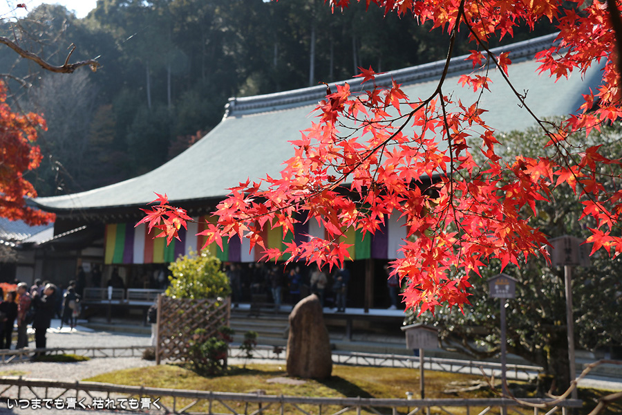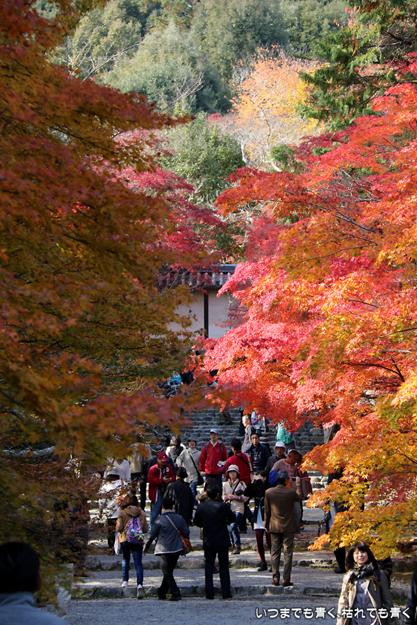 また京都に奥さんと長女と三人で行ってきました。二年ぶりの嵯峨野嵐山の紅葉狩りが目的です。紅葉の時期の嵐山はいつも使う駐車場が観光バス専用になりますので、右京区役所前のパーキングに車をおいて嵐電天神川駅から嵐電で嵯峨野嵐山にはいります。いつも思うのですが、京都は観光地にもかかわらず駐車料金は一日400円とか500円なので良心的です。嵯峨野に着いて定番の二尊院、祇王寺、常寂光寺をまわるだけで、非日常の時間はあっという間に過ぎてしまいます。戻ってきた夕方の渡月橋界隈はすごい人。渡月橋には長い人の列、交通規制のかかった道路は人・人・人・・・。こんなのは京都にはいらないぞと思ってしまうゆるキャラも出現しておりました。最初の二尊院の紅葉です。ここの紅葉をみなくては嵯峨野に来たとは言えないほどの定番のお釈迦様と阿弥陀様のお寺。まさに見ごろの紅葉と境内の雰囲気が最高に絵になるお寺です。
