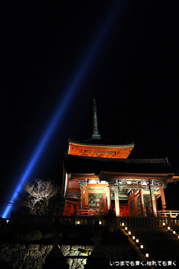 今年の秋の京都のしめくくりは、清水寺夜の特別拝観のライトアップです。清水寺の夜の拝観は、春、夏、秋と年三回行われていて、私は春の東山花灯路の時にけっこう来ているのですが、秋の紅葉の時期に来るのは初めてです。そもそも紅葉の時期は、嵐山、東福寺や南禅寺近辺に行くことが多いので、どうしても清水寺は来る機会が減ります。夜なので紅葉の色づき具合はわかりませんが、本堂の舞台からみるライトアップされた紅葉、奥の院から見るライトアップされた清水の舞台は、とても美しいものです。観音様の慈悲の心を表している青い光の筋が幻想的で、朱色の仁王門や三重塔、ライトアップでオレンジ色に染まる清水の舞台とよく合います。