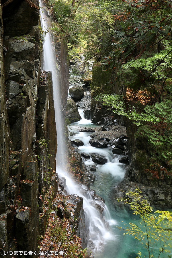 次は、付知峡不動滝に来ました。不動滝、観音滝、仙樽の滝の三滝があり、一番落差のあるのは観音滝ですが、観音滝は水路から水を流しているようで人工滝のようでした。そのせいか、観音滝の名前はあまり表面に出ず、不動滝と観音滝を合わせて不動滝と呼んでいるようです。コバルトブルーの滝つぼを眺めながら水の音を聞いていると、心落ち着きます。滝のまわりの紅葉はまだちょっと早めで、紅葉の写真というより滝の写真という趣です。
