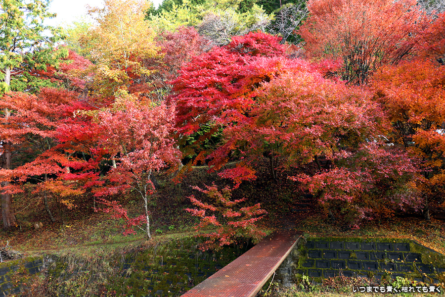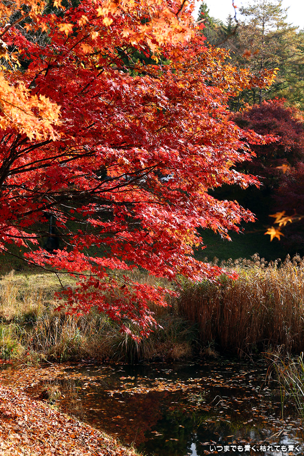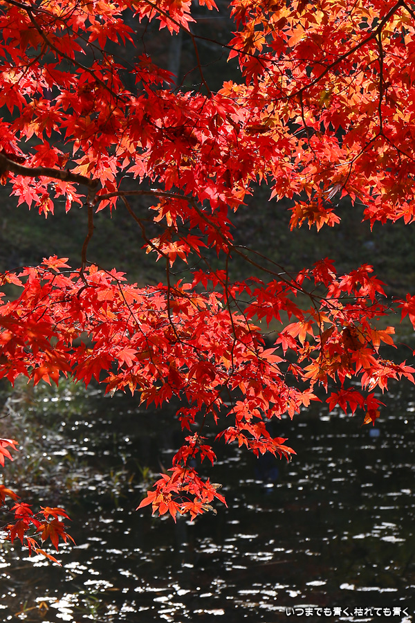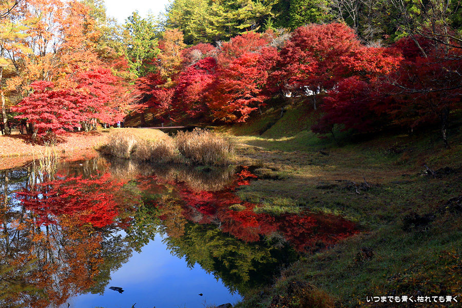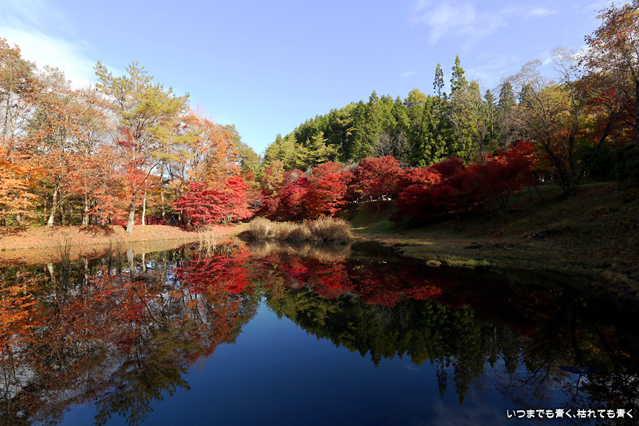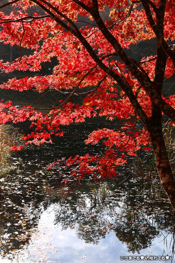 駐車場整理をしていた方に紅葉の状況を伺った時に「少し遅いと思うのでがっかりしないでね」と言われたのですが、がっかりするところなどはまったく無くまだまだ見頃で美しい紅葉でした。風がなく静かな池の水面にうつる紅葉と青空も素敵でした。広くはないところですがそれほど人も多くなくのんびりと紅葉を楽しめるいいところでした。