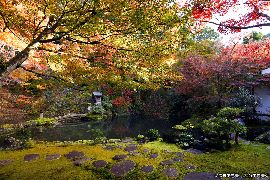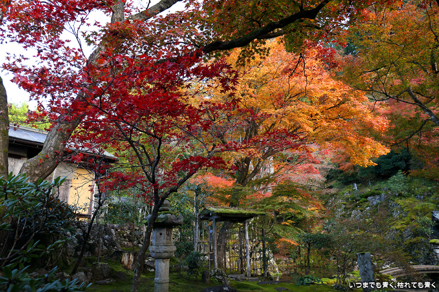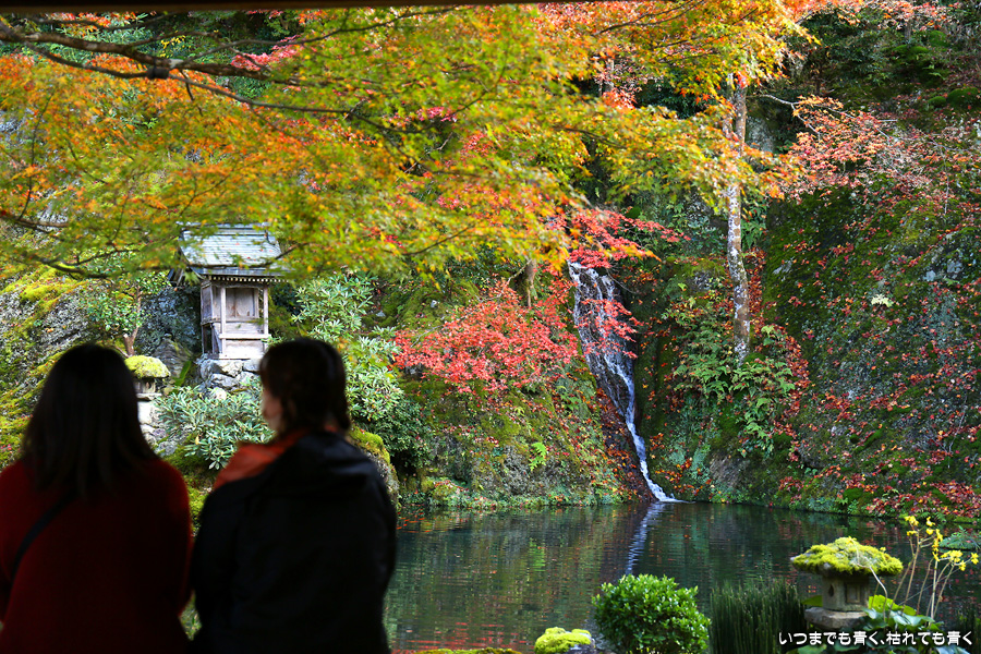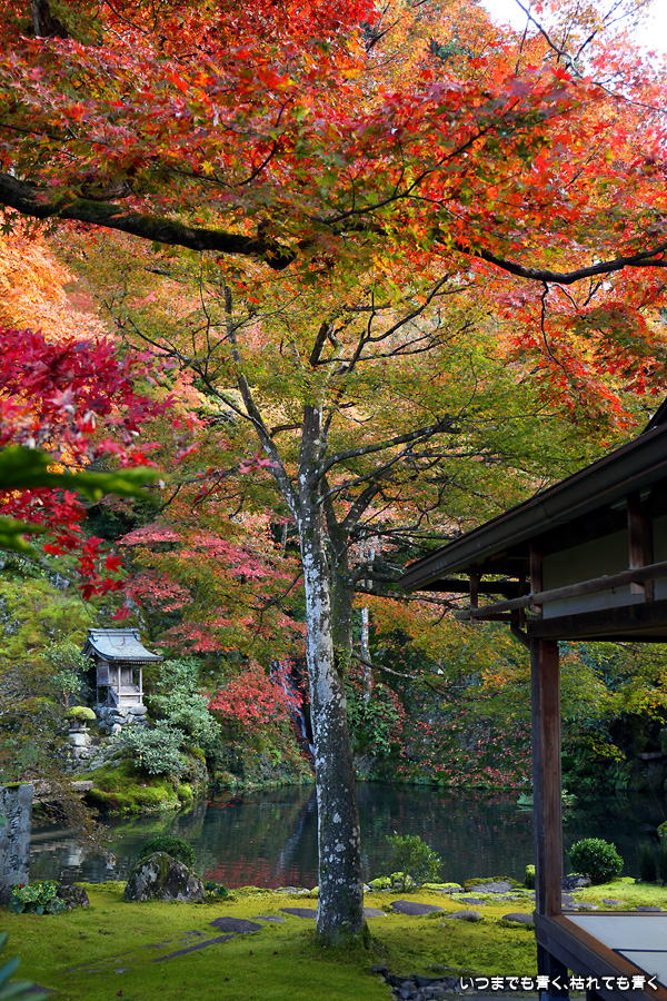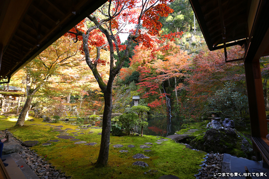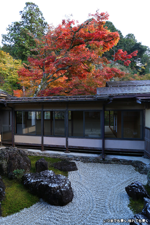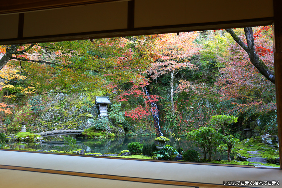 このお寺には「てっ(草かんむりに至)草園」という庭園があり、畳や縁側に座ってのんびりと庭を眺めることができます。庭園の紅葉は、一部は見ごろですが手前はまだ青葉のままで、紅葉の風景の迫力はまだ今一歩という感じでした。
