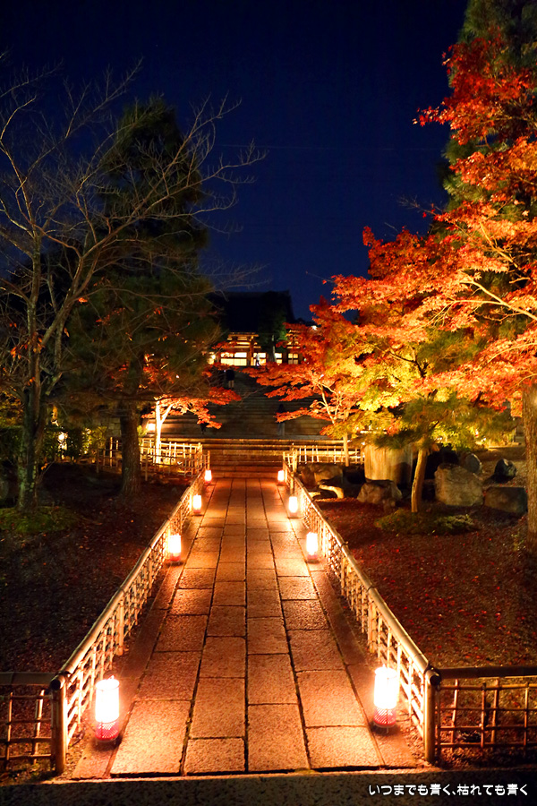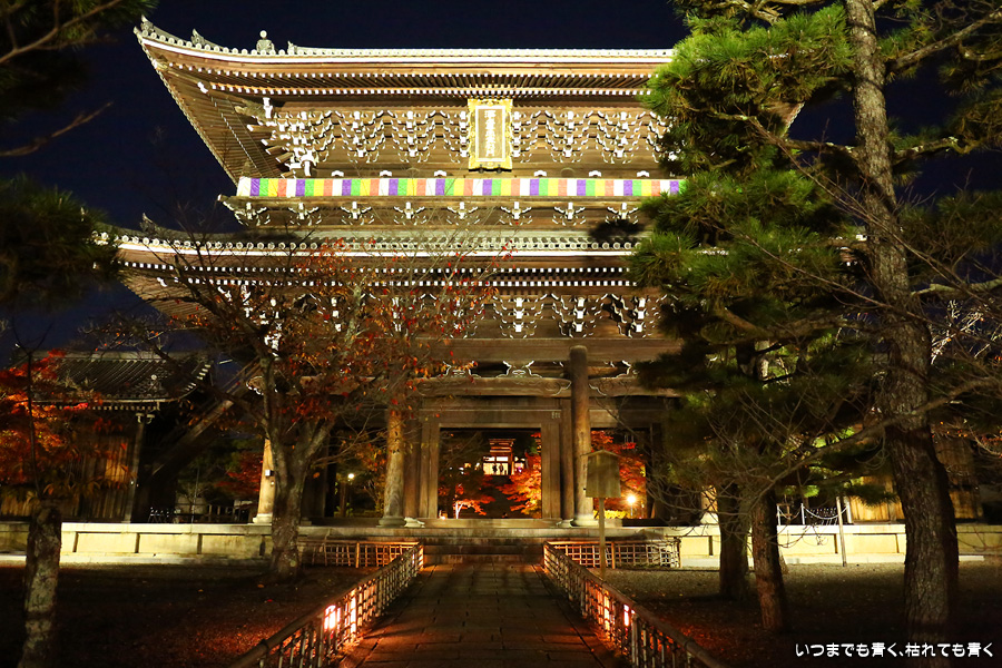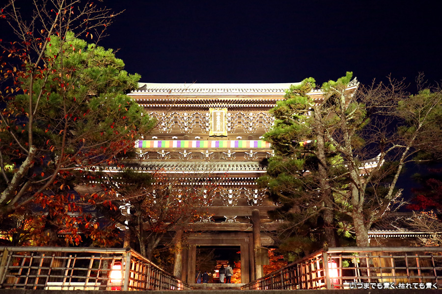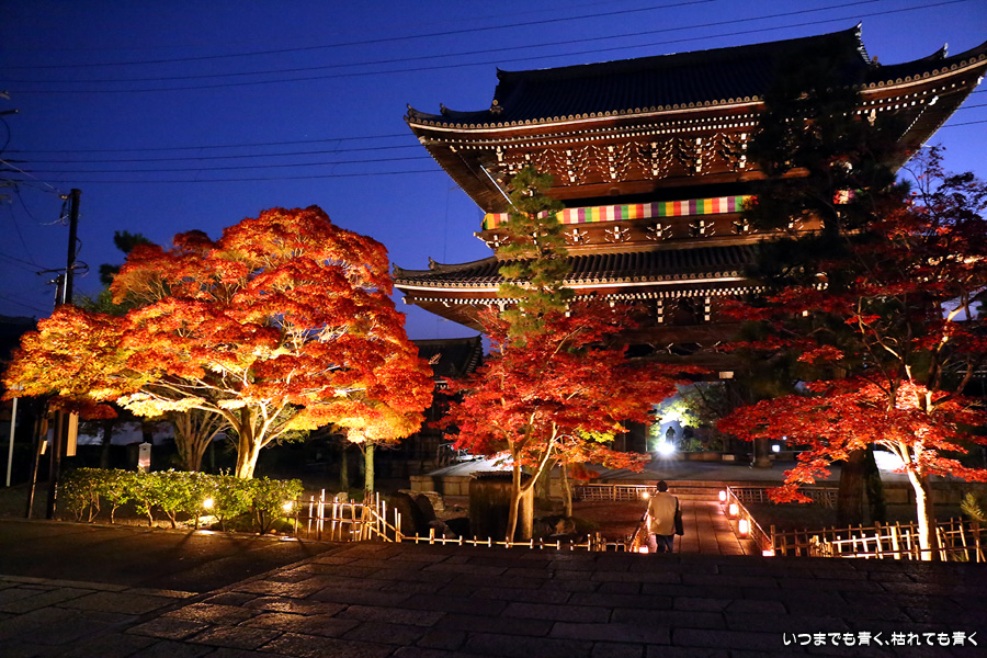 金戒光明寺の有料駐車場に車を止めて寺社巡りをしていたので、すべての予定を終えて戻ってきた時に撮影しました。ライトアップの撮影時には、ISOは100から400あたりの低感度固定、シャッターと絞りは自分で設定するマニュアルモード、ホワイトバランスは後で変更できるようにRAW保存、というのが私の撮影方法なのですが、この時は疲れていたのでオートモードで撮影してしまいました。ホワイトバランスも太陽光なので、赤味のかかった仕上がりになっています。ちなみにISOは12800となっており、かなり粗くなってしまっています。でもまぁ、写真なんて雰囲気が伝わればいいという割り切りも必要かなと思います。