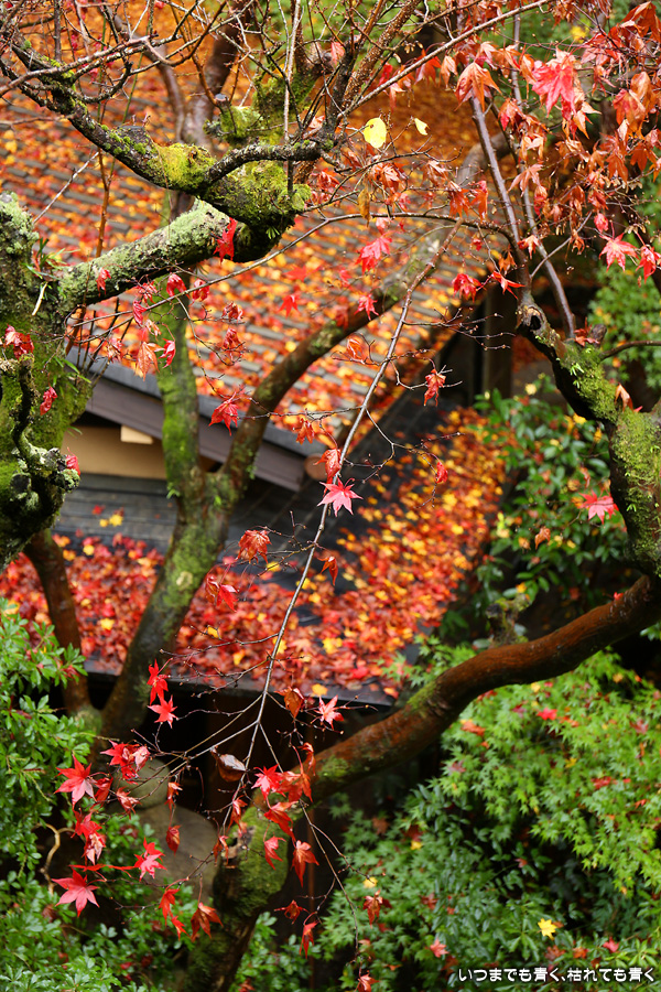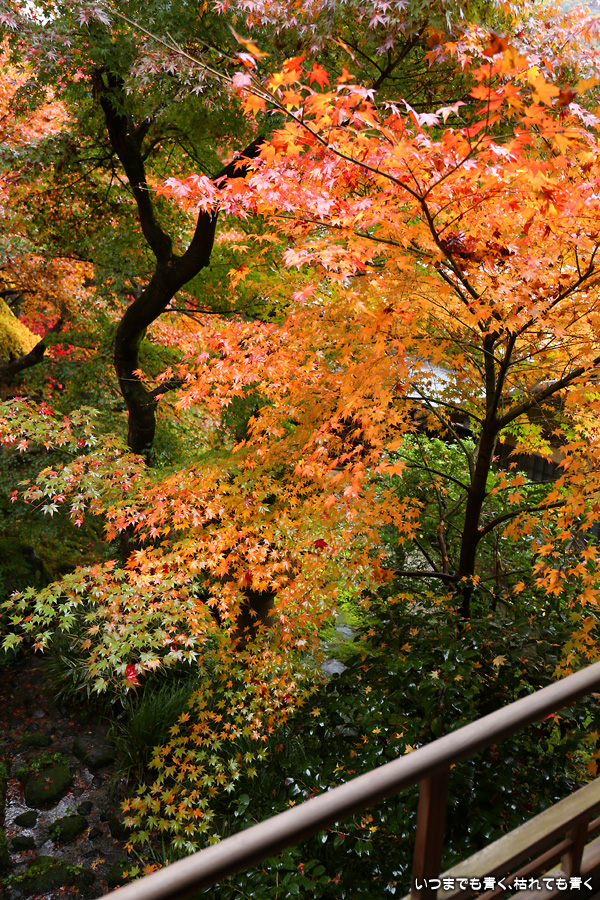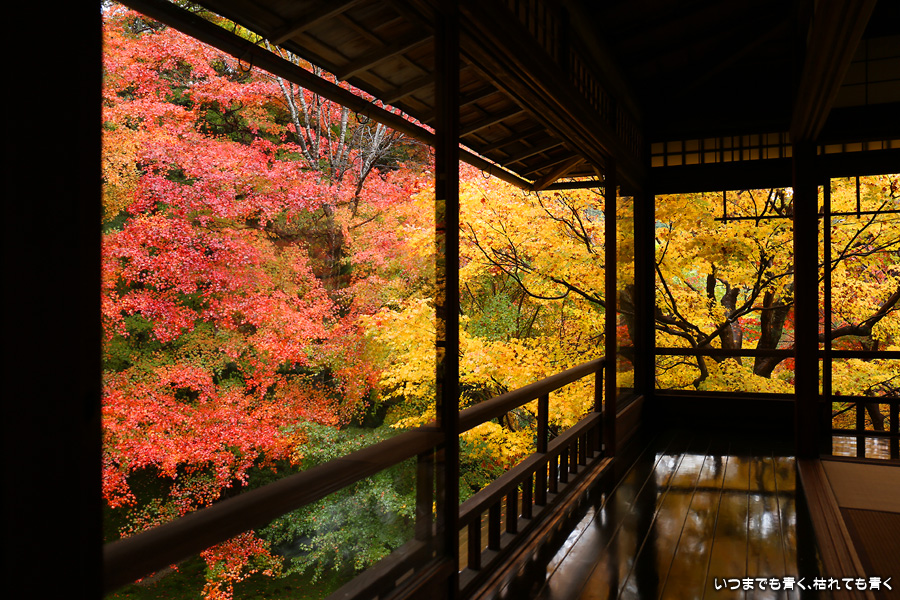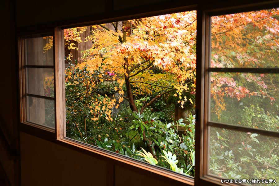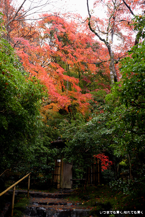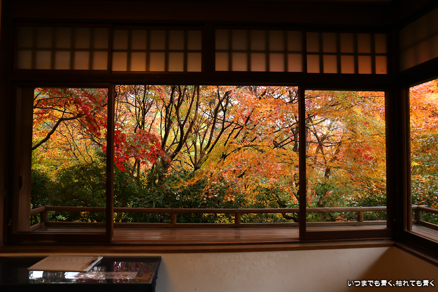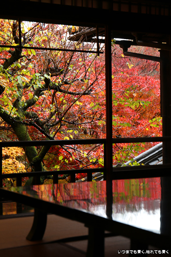 瑠璃光院は、コロナ以前から予約制であったことと拝観料が2,000円と高いということで、なんとなく「見せてやる」というような高飛車的なイメージを持っていました。なので今年も最初は行くつもりなかったのですが、5泊6日京都ぶらり旅の出発日前日の11月19日時点でちょうど真ん中の11月23日が本降り雨予報でどうしようかと考えた時に、瑠璃光院ならば室内だし行ったことがないので行ってみるのもいいかということで拝観を決めました。すぐに予約を調べると、23日は祝日ながら天気予報が良くないせいか13時にまだ空きがあり予約もできました。そういう経緯で拝観した瑠璃光院ですが、思っていた以上にとても良かったです。どこからも絵になる情景ばかりで眺めて写真を撮っていたらあっというまに1時間は経ってしまいます。ただ、時間制でも追い出されたりすることはなく、ゆったりと楽しむことができました。真面目な私は長居はよくないと思って後ろ髪引かれる思いで出てきましたが、もう少し長居をさせていただいて構図をいろいろと考えればいい写真が撮れたかもしれません。特に雨に濡れた庭は風情を感じられて素敵でした。また、机に映り込む有名な写真の撮影は、私が撮った位置よりももう少し下から撮るのが正しかったようです。お寺の方の対応は、事前に勝手に抱いていた高飛車的な対応とはまったく異なり、とても丁寧で親切でした。たぶん、来年から瑠璃光院ははずせない場所になりそうです。