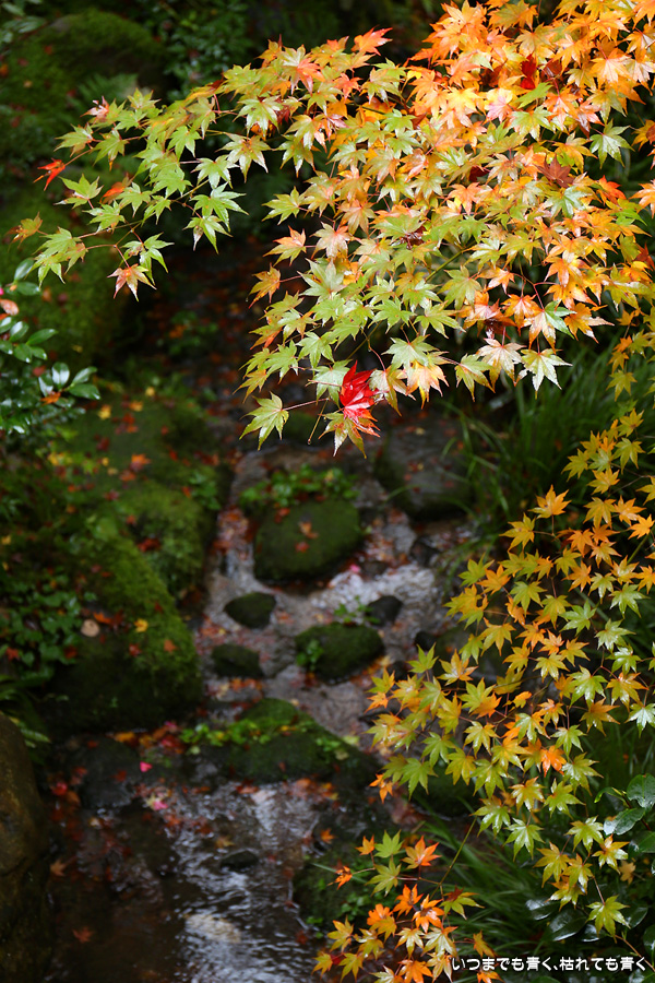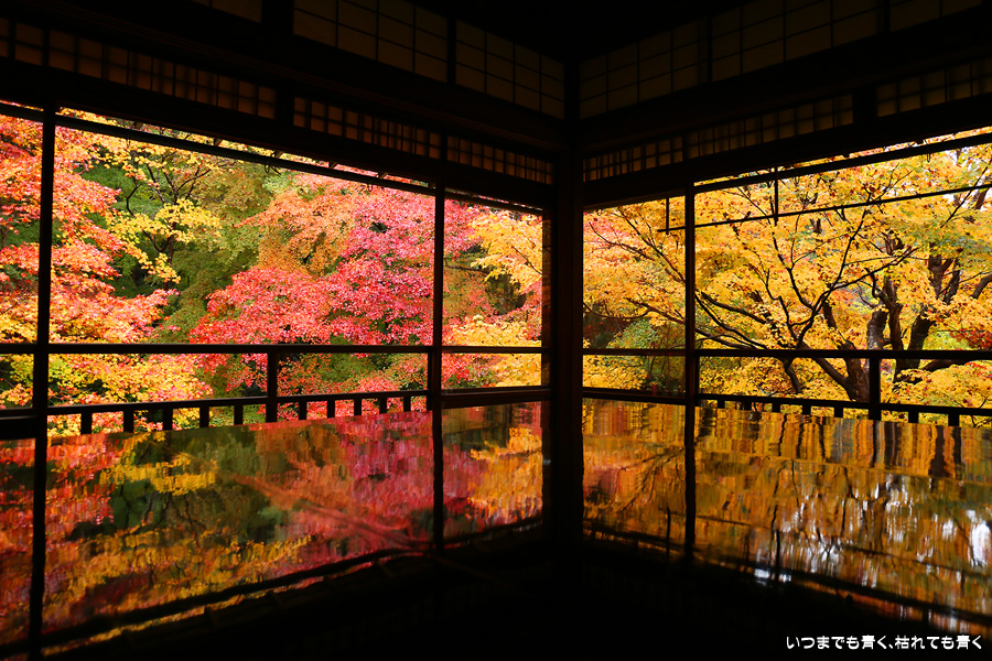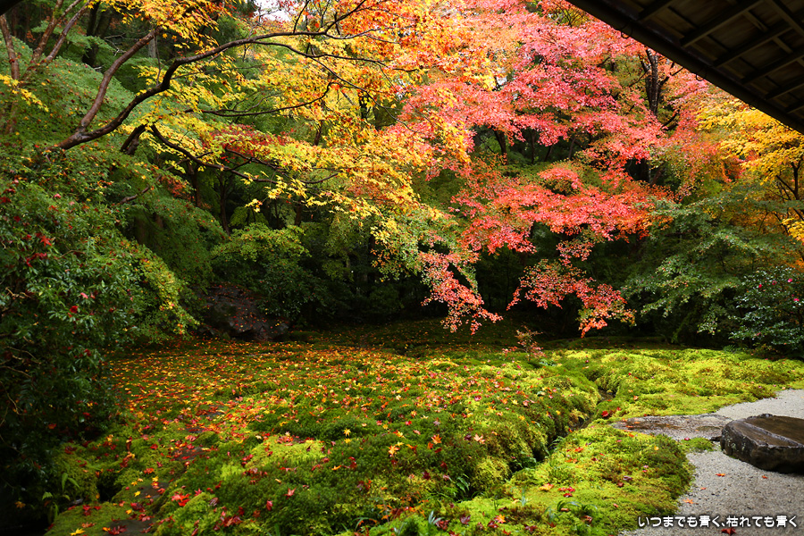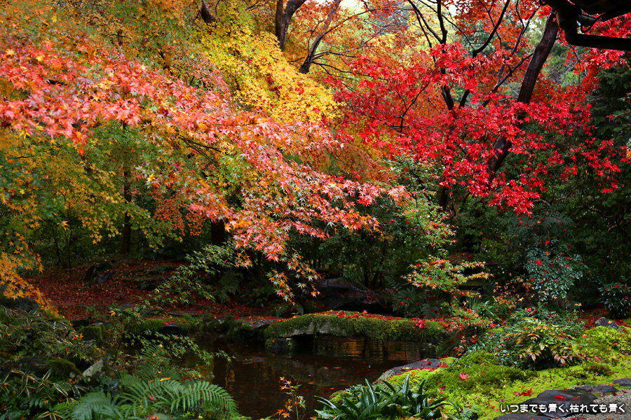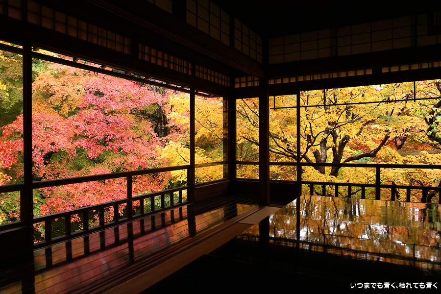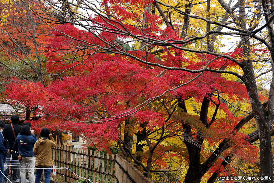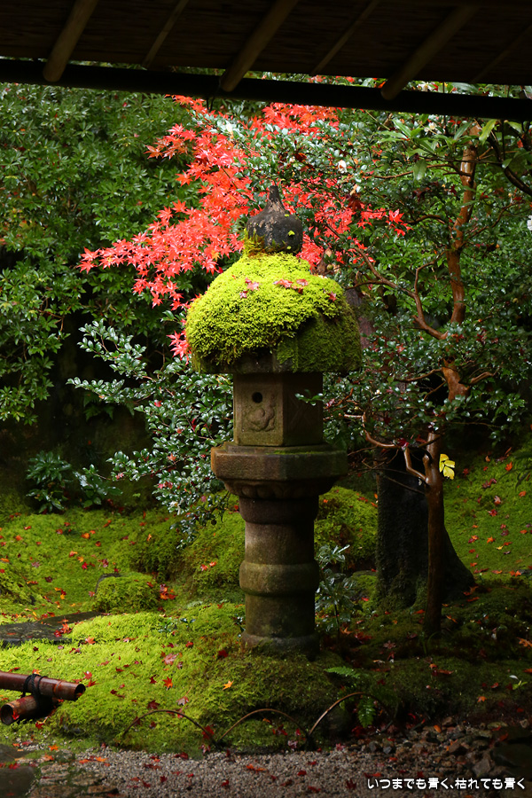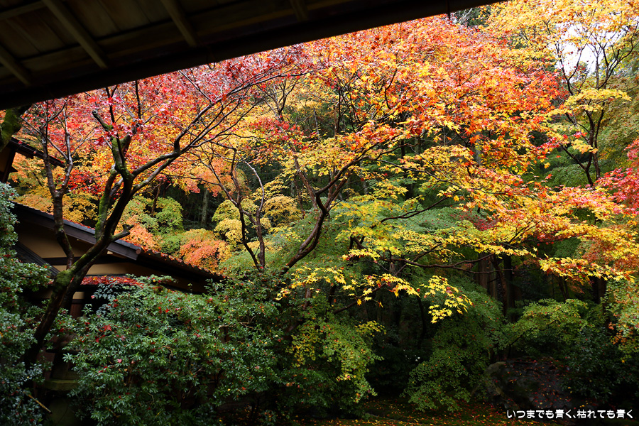 瑠璃光院は、コロナ以前から予約制であったことと拝観料が2,000円と高いということで、なんとなく「見せてやる」というような高飛車的なイメージを持っていました。なので今年も最初は行くつもりなかったのですが、5泊6日京都ぶらり旅の出発日前日の11月19日時点でちょうど真ん中の11月23日が本降り雨予報でどうしようかと考えた時に、瑠璃光院ならば室内だし行ったことがないので行ってみるのもいいかということで拝観を決めました。すぐに予約を調べると、23日は祝日ながら天気予報が良くないせいか13時にまだ空きがあり予約もできました。そういう経緯で拝観した瑠璃光院ですが、思っていた以上にとても良かったです。どこからも絵になる情景ばかりで眺めて写真を撮っていたらあっというまに1時間は経ってしまいます。ただ、時間制でも追い出されたりすることはなく、ゆったりと楽しむことができました。真面目な私は長居はよくないと思って後ろ髪引かれる思いで出てきましたが、もう少し長居をさせていただいて構図をいろいろと考えればいい写真が撮れたかもしれません。特に雨に濡れた庭は風情を感じられて素敵でした。また、机に映り込む有名な写真の撮影は、私が撮った位置よりももう少し下から撮るのが正しかったようです。お寺の方の対応は、事前に勝手に抱いていた高飛車的な対応とはまったく異なり、とても丁寧で親切でした。たぶん、来年から瑠璃光院ははずせない場所になりそうです。
