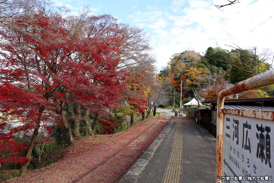 名鉄三河線は、山線(知立駅から北側)、海線(知立駅から南側)で一部廃線となっています。山線は猿投駅〜西中金駅間が1990年に電車からレールバス(気動車)に変更、2004年に廃線となっています。三河広瀬駅は、その中の中間駅となります。廃線跡は分断されていますが、三河広瀬駅の両端は踏切だったところを除きまだ線路が残っていて、今でも列車が走って来そうな雰囲気があります。三河広瀬駅周辺は紅葉と四季桜が美しく、この日も幼児連れの奥様方が多く来ており写真を撮っていました。