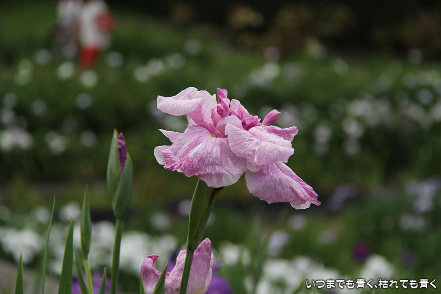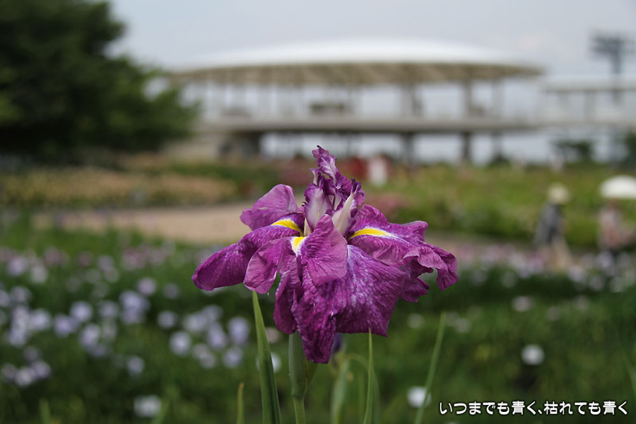 7月8日までは「あじさい・花しょうぶまつり」ということになっていましたが、紫陽花はもう時期が過ぎていました。しかも、花壇に植えられた紫陽花というのは、風情がなくてダメでした。紫陽花という花は、寺社などの庭が似合うような気がします。そのかわりに楽しんできたのが、花菖蒲。花菖蒲は、たくさんの数と種類が植えられていて、のんびりと眺めて楽しむことができました。花菖蒲も、紫陽花の花壇に囲まれた場所に植えられていて、周りの風景との調和を楽しむという風情はありませんが、数が多いので花菖蒲同士で構図をとって写真を楽しむということはできました。構図決めはなかなか難しいですが。相変わらず、ありきたりの構図の写真ですが、花菖蒲苑の雰囲気を残しておければと思います。