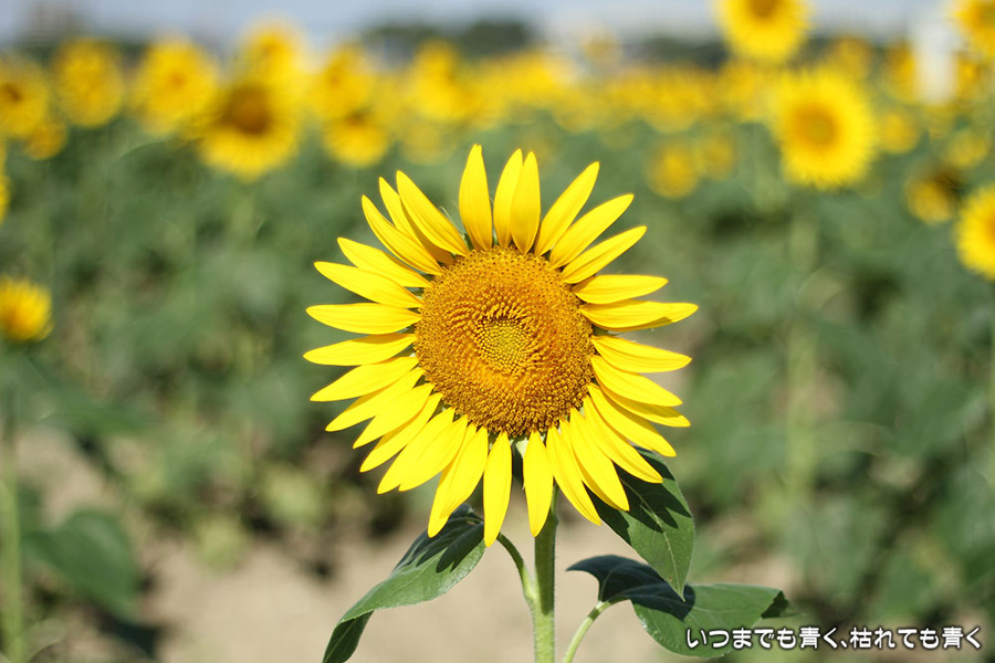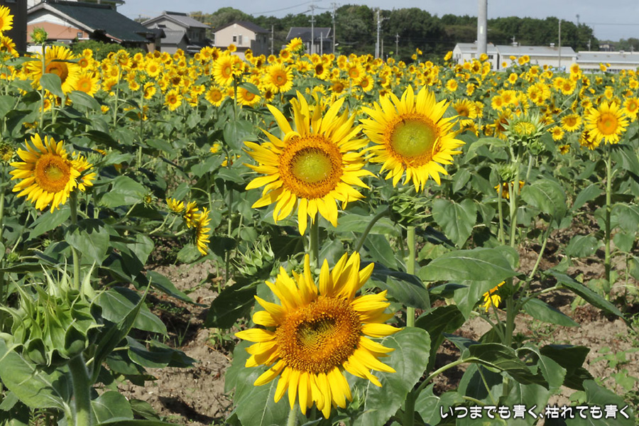 自分で運転していると気づきにくいのですが、先週、バスに乗って窓の外を眺めていて、家の近くの休耕地に向日葵(ひまわり)畑があることを知りましたので、今日、カメラを持って出かけてきました。そのあたりの休耕地は、農林水産省の農地・水・環境保全向上対策として、景観植物が植えてある場所です。以前に秋桜(コスモス)を撮りに来たことはあるのですが、向日葵が植えられているのは、初めて知りました。向日葵畑の隣の土地には秋桜の看板がありますので、もう少ししたら秋桜もまた楽しめるようです。向日葵は少し小ぶりの向日葵でしたが、これから咲こうとするものもあって、今が見頃とばかりに元気に美しく咲いていました。向日葵にはたくさんのミツバチが集まってきていて、一生懸命に花粉を集めているのが可愛らしかったです。周辺は住宅や電線があったりで、撮影に適した土地とは言い難いですが、夏が終わってから(残暑は厳しいですが・・・)向日葵畑に出会えるとは思っていませんでした。忘れた夏を取り戻したような感覚でした。