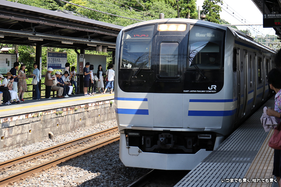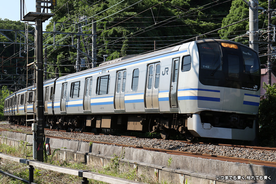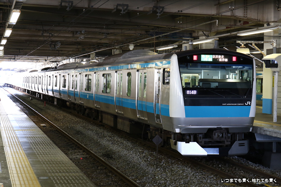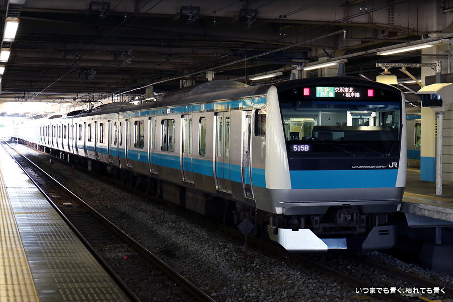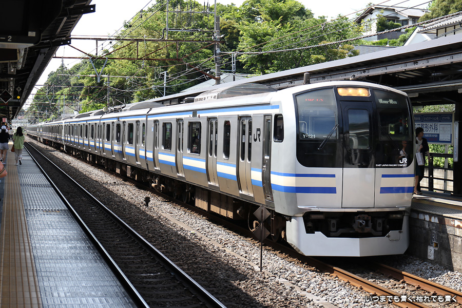1枚目と2枚目は編成番号「114」で同じものですが、折り返しで列車番号が「515B」から「814B」に変りましたので別々に載せました。その後のE217系は、同じように見えますがすべて編成番号が異なる別車両(Y-16、Y-23、Y-42、Y-121、Y-50、Y-49)です。