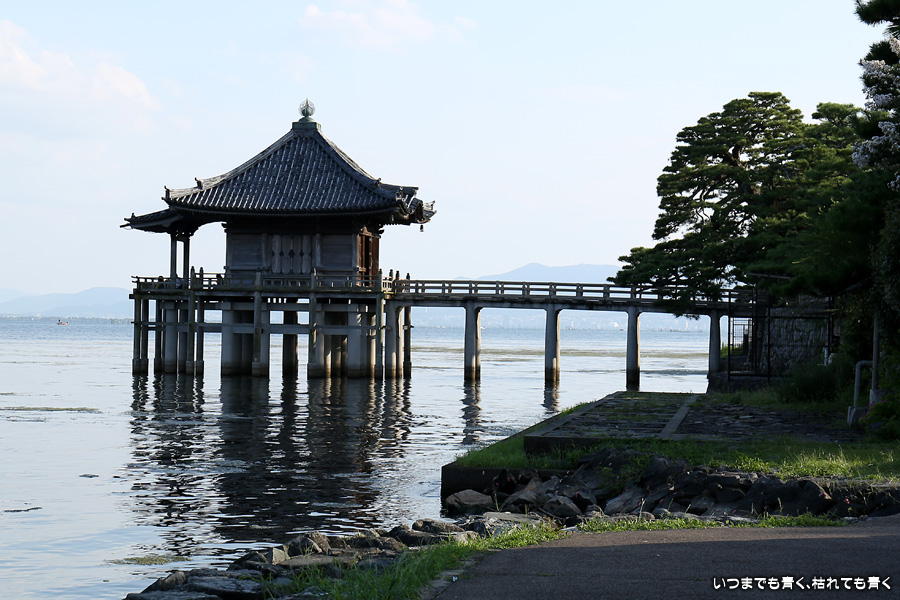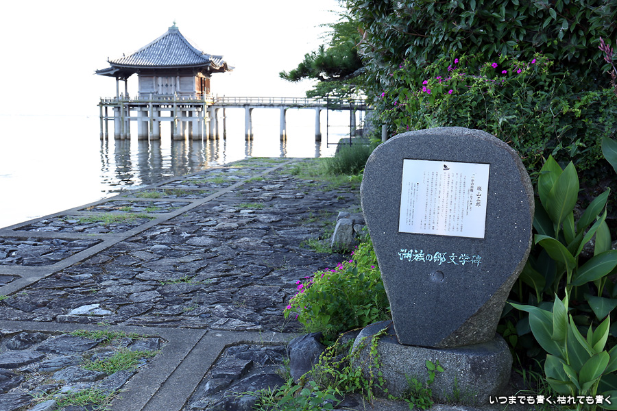 一週間前に来た浮御堂の北側からの写真を撮りたくて今週あらためてやってきました。ここで2時間サスペンスドラマでは最後の謎解きをしたりするシーンに使われます。ここは浮御堂の境内ではなく普通の湖畔道なので、拝観とは関係なく立ち寄って眺めることができます。ロケ地好きにはたまらない場所です。