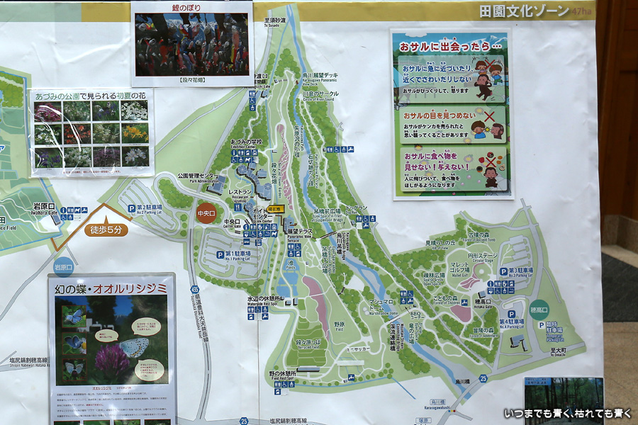 善光寺参りの翌日に我が家と次女の家族で訪れました。ここは、次女夫婦と孫のリクエストで訪れましたが、立派でとても広い公園でした。いくつかのエリアがあるのですが、今回は田園文化ゾーンだけで半日しっかりと楽しむことができました。中央口のガイドセンターから入場し、あづみの学校を見て、展望テラス、段々花畑、烏川吊橋を通って、穂高口の子供の森で遊び、そこで猿と遭遇し、帰りは渓流連絡橋を渡って展望テラス、ガイドセンターに戻ってきました。11時半に入場し退場したのは16時になっていました。途中一時的に雨が降りましたが、ちょうど展望テラスにいた時だったので、雨に濡れることなく雨宿りができたのは幸運でした。近くならばなんども訪れて散策を楽しみたい公園でした。