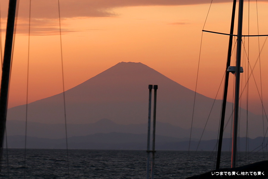 三浦市三崎から横浜へ戻る途中に、美しい夕陽と富士山が見えたので、葉山マリーナ横のコンビニの駐車場に車を止めて撮影した写真です。葉山マリーナとコンビニ駐車場の間にはワイヤーフェンスがあってその隙間からの撮影ですが、数枚撮っているうちに夕日は沈んでしまいました。運転中に見つけた光景なので、これだけでも撮影出来て幸運でした。
