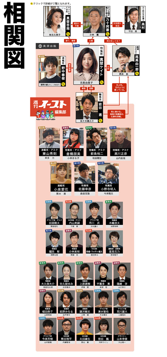 真壁ケイト:吉高由里子 / 尾高由一郎:柄本佑 / 野中春樹:重岡大毅 / 小野寺明人:今井隆文