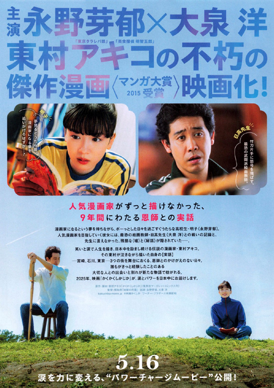 とても良い映画でした。奥さんからもまわりの観客からもすすり泣きが聞こえてくる、そんな映画でした。作者の東村アキコ氏がこの物語を大切にしていた気持ちがよくわかります。竹刀を持って「描け!描け!」と叫ぶ日高は乱暴な感じで最初は描かれていますが、実は損得無いまっすぐな気持ちの持ち主で、自分をうまく表現できない優しい人間であることがわかってきます。若い時はそういう日高を理解できなかった明子ですが、その時の会話や行動はとても面白くて思わず笑ってしまうというシーンが多かったです。しかし、次第に日高の優しさに触れて信頼していくという過程では、ほろりとするシーンが増えていきます。そして、最後は悲しいながらも未来に希望に向かって「描け!」といういいシーンで終わります。私は、泣くというよりも、ほんわかした優しい物語だなぁという感じでした。