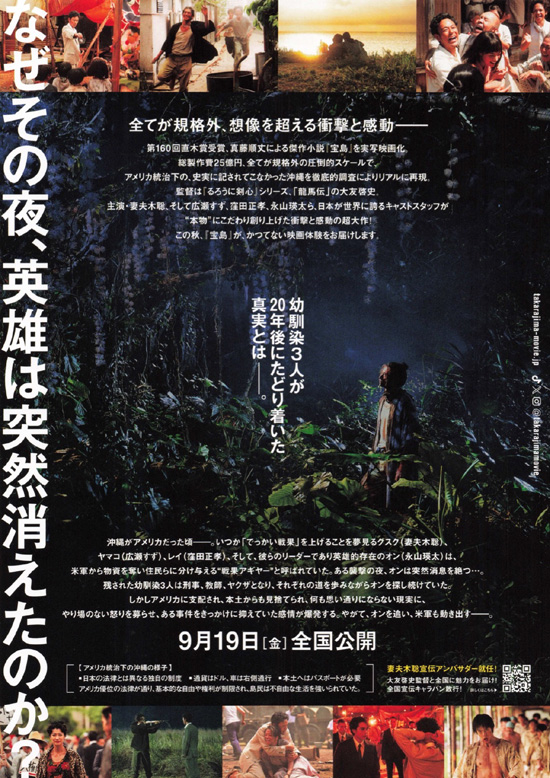 1952年、米軍統治下の沖縄。米軍基地を襲撃して物資を奪い、困窮する住民らに分け与える「戦果アギヤー」と呼ばれる若者たちがいた。そんな戦果アギヤーとして、いつか「でっかい戦果」をあげることを夢見るグスク(妻夫木聡)、ヤマコ(広瀬すず)、レイ(窪田正孝)の幼なじみの若者3人と、彼らにとって英雄的存在であるリーダー格のオン(永山瑛太)。しかしある夜の襲撃で米軍に見つかるという失敗を犯し、その時に“予定外の戦果”を手に入れたオンはそのまま消息を絶ってしまう。残された3人はオンの影を追いながら生き、やがてグスクは刑事に、ヤマコは教師に、そしてレイはヤクザになり、それぞれの道を歩んでいくが、アメリカに支配され、本土からも見捨てられた環境で、思い通りにならない現実にやり場のない怒りを募らせていく。そして、オンが基地から持ち出した“何か”を追い、米軍も動き出す・・・ |