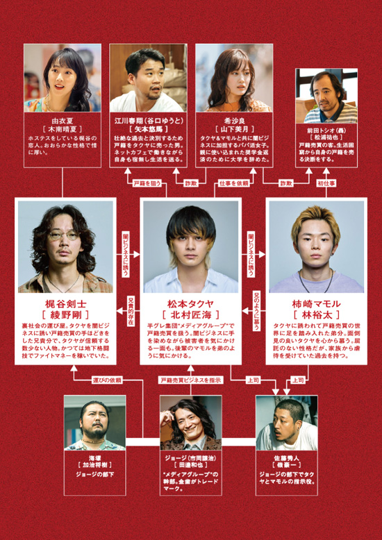 タクヤ(北村匠海)とマモル(林裕太)はSNSで女性を装い、身寄りのない男たちから言葉巧みに個人情報を引き出して戸籍売買を行っている。劣悪な環境で育ち、気づけば闇バイトを行う組織の手先となっていた彼らだったが、時には馬鹿騒ぎもする普通の若者だった。タクヤは自分が闇ビジネスの世界に入るきっかけとなった兄貴的存在の梶谷(綾野剛)の手を借り、マモルとともに裏社会から抜け出そうとするが・・・ |