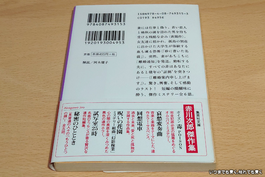 「湖畔のテラス」は妻と姪の冷ややかな態度が恐ろしい。若い恋人が可哀想に感じるとともに、夫の心情もちょっと切ない。「真夜中の停電」は、妻の変心がこれも恐ろしい。ただ、この夫はどうしようもない気もするがどこにでもいるような男なので、結果は悲劇的。「砂に書いた名前」は、最後まで何が真実かわからず、意外性あり。しかし、こんな恐ろしい女友達ならば孤島でなくてもなんとなくわかるはず。「静かな闘い」は、この家族が切ない。自分が男の立場だったらきっと復讐に燃える。気持ちをわかってくれてとめてくれる部下がいることが救いだけれど、死んだ妻はそれを喜ぶか?「離婚案内申し上げます」は、一番心を打たれた素敵な一編。最初は妻の仕返しのように思えたことは、実は自分を忘れてほしくない心と、残される夫のための行動だった・・・「窓際連盟」は、そもそもの設定が極端すぎて、さすがに一課長の意思でそんな酷いことができるのかという違和感あり。古い作品だから仕方がないが、今の時代ならばあきらかに酷いパワハラ。窓際連盟の仕返しも、陰気臭くて痛快感が乏しい。