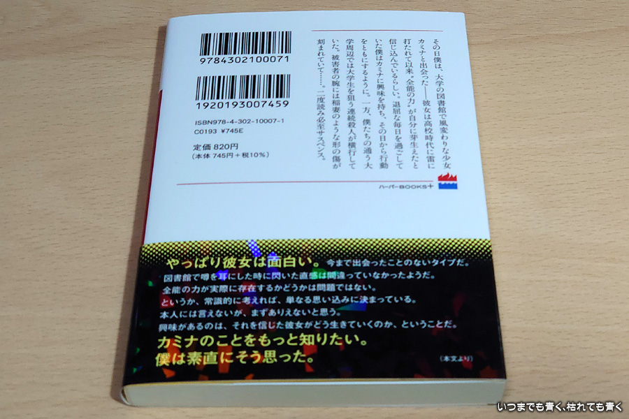 途中までは「全能のカミナ」がどういう力を使って物語が面白くなるのかという期待で読み進めたのですが、いくら読んでもカミナの能力が連続殺人事件に解決に有効に働きません。それよりも、退屈しのぎにカミナに近づいて、全能のカミナが本物なのか、何か刺激的な出来事に遭遇できるかという「僕」の思いばかりが前面に出る物語で、思っていた面白さとは異なっていました。