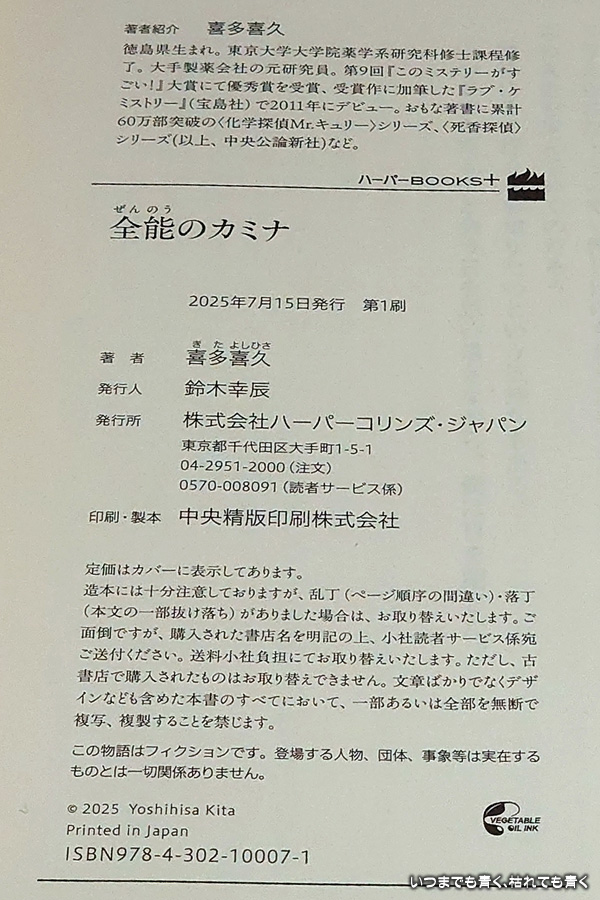 全能のカミナの魅力が描かれないのであれば、周辺で起きている連続殺人事件の謎解きが次の魅力になるのですが、その謎も、「僕」の行動や気持ちが不穏なところから、まさか主人公の「僕」が犯人ではないかという思いがだんだんと膨らんでいき、結局その通りの結末という、なんとも面白味が無くて書き手が犯人というずるい作品でした。きちんと結末が知りたいという気持ちと、文章が退屈ではないので最後まで読み切りましたが、小説としては期待外れのがっかり感を感じる作品であり、魅力を感じるものではありませんでした。「二度読み必至サスペンス」と書かれていますが、意外性がないので二度読みしたいとは思いません。犯人の動機や心情も薄くて共感できませんし、連続殺人事件とカミナとの話のつながりが乏しいですし、終わり方も犯人逃亡のままで今後に含みを持たせているようですが、なんか釈然としない作品でした。