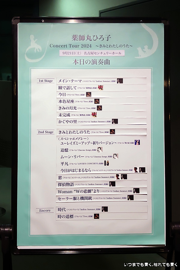 皆さま、本日はようこそ「2024コンサートツアー〜きみとわたしのうた〜」にお越しくださいまして本当にありがとうございます。薬師丸ひろ子です。名古屋にもよくお邪魔していますが、この名古屋センチュリーホールでコンサートをさせていただくのは初めということでこんなに多くのお客様にお目にかかれて頑張らなくちゃという気持ちになっています。私は、この大袈裟なドレスを着ていますしほとんどここから動くことはありません。皆さんに無理強いして立っていただいたり辛い思いをさせることもありません。何も皆さんに強要することはありません。今日は楽しんでいただきたいと思います。次はアルバム「Tree」から「今日」という歌を聴いてください。