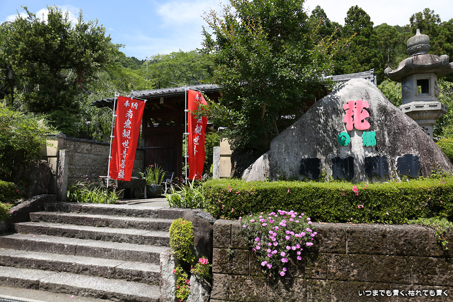 紫陽花の咲き具合はまだこれからという感じでした。ただ、咲き具合だけではなくネットで見た写真の雰囲気と違う感じがしたので、本堂の掃除をされていたご住職の奥様に声をかけて紫陽花の咲き具合などについてお尋ねしました。花や庭の手入れが好きなご住職が昨年末に急に亡くなられたこと、冬に大雪で紫陽花が潰されてしまったことで、手入れ不足で咲き具合がよろしくないのだそうです。その他にも、サツキの木も手入れを頼んだ若い人が芽まで切ってしまい花が咲かなかったこと、本堂の裏には石楠花と紫陽花がたくさんあったのに手入れが大変だとすべて抜いてしまったこと、橘の木や松の木が虫にやられて枯れてしまったこと、鐘楼の脇の大きなしだれ桜が台風で半分折れてしまったこと、檀家のいないお寺なので維持が大変なこと、いろいろと話をしてくださいました。終始にこやかにお話してくださるのですが、お寺の維持、庭園の維持は大変なのだなと思いました。弓削寺は、最澄がこの地を訪れた時に温泉が湧いているのを見つけ、そこを錫杖でかき回したところ馬頭観音が現れたことから、その馬頭観音を祀るために寺が建てられ、その話にちなんで湯華寺と名付けられ、その後白河法皇が華厳寺参拝の帰路に急病になり、ここの温泉で平癒したにより同じ読みで弓削寺を賜ったそうです。今もこの地には温泉があり弓削寺が経営している温泉施設があります。そんな話や、本堂の天井絵のお話、左甚五郎の生まれた地が近くにあったのが縁で左甚五郎の一番弟子が掘った欄間彫刻のお話、アオガエルがたくさんいたお話など伺い、一時間くらい話し込んでしまいました。数年前は、本堂裏の池や紫陽花、参道のたくさんの紫陽花を楽しめたそうなので、もう少しここを知って早く来ていればなぁという後悔と、できるならば以前のような美しい花寺に戻ってほしいという願いで帰路につきました。