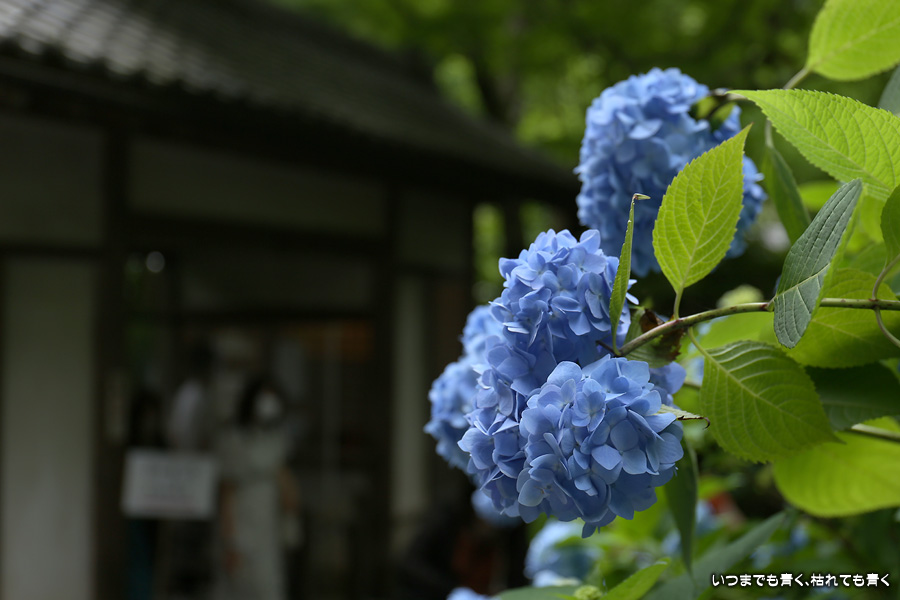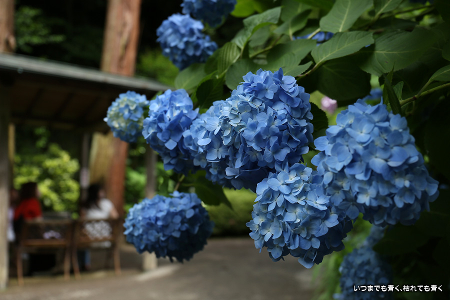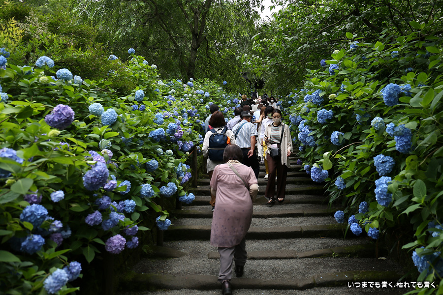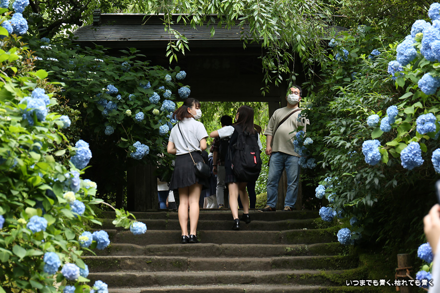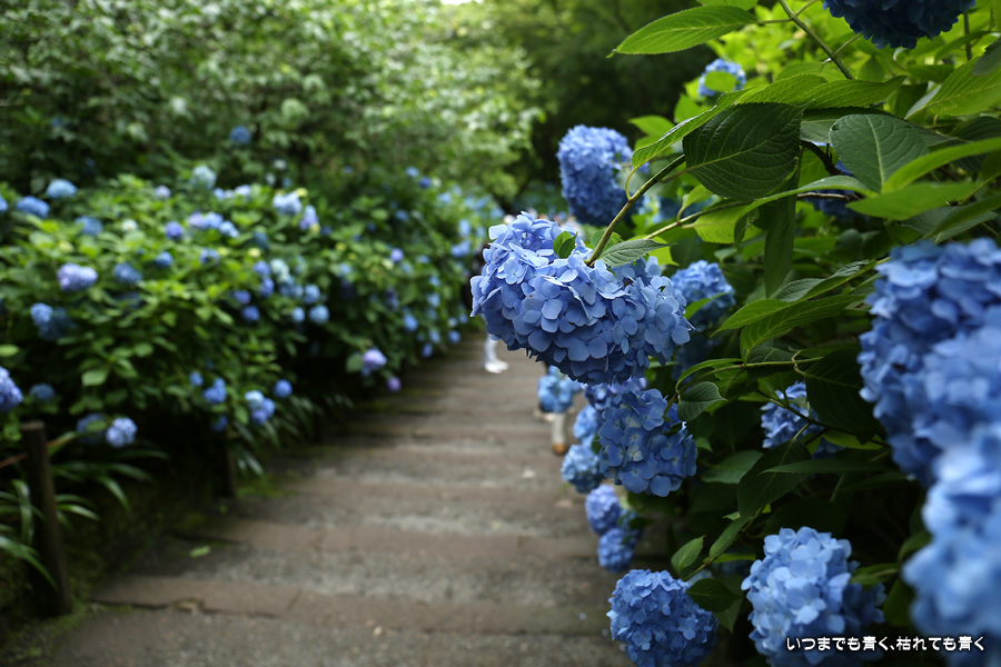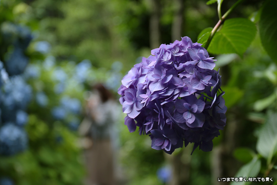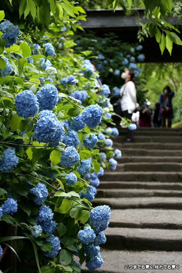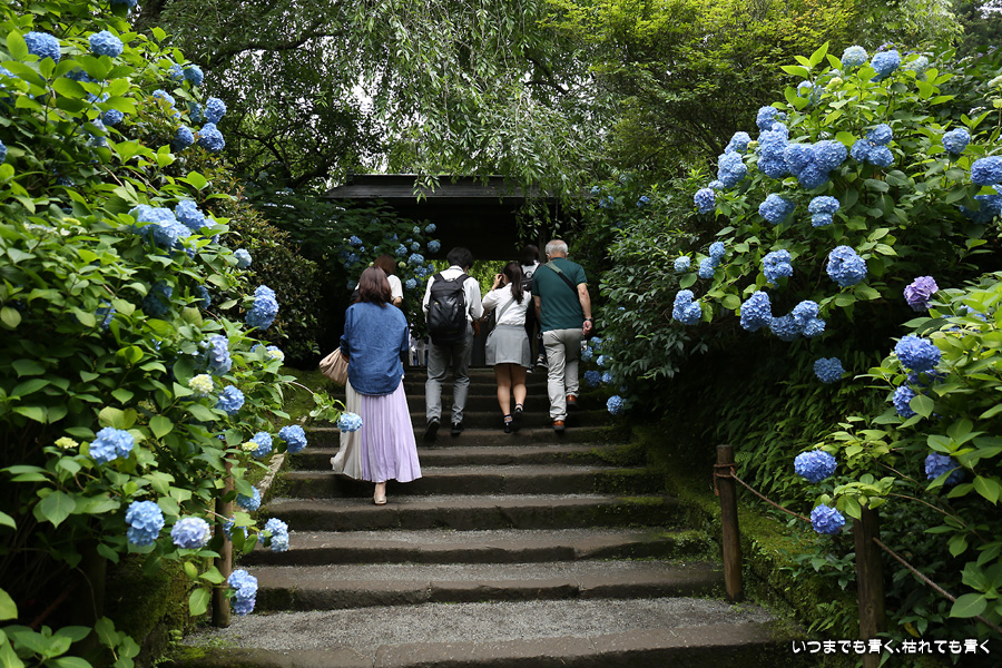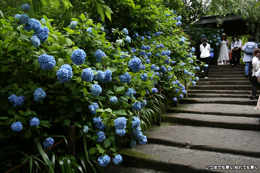 「ここは青い紫陽花ばかりだね」という声がたまに聞こえてきますが、明月院と言えば明月院ブルーの紫陽花です。今年は早めに来たせいか紫陽花の花が若々しくて美しいものばかりでした。明月院ならではの構図で撮影しようと心がけましたが、ひとつひとつの花が美しいので、ついアップで撮ってしまうことも多かったです。人が多くて人を入れない写真を撮るのは難しかったので、人を入れて撮影した写真が多くなりました。