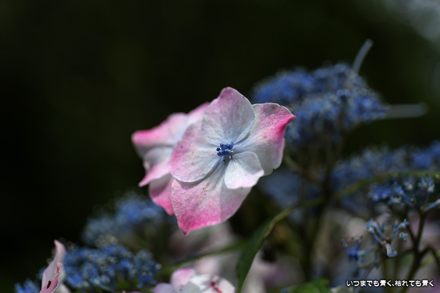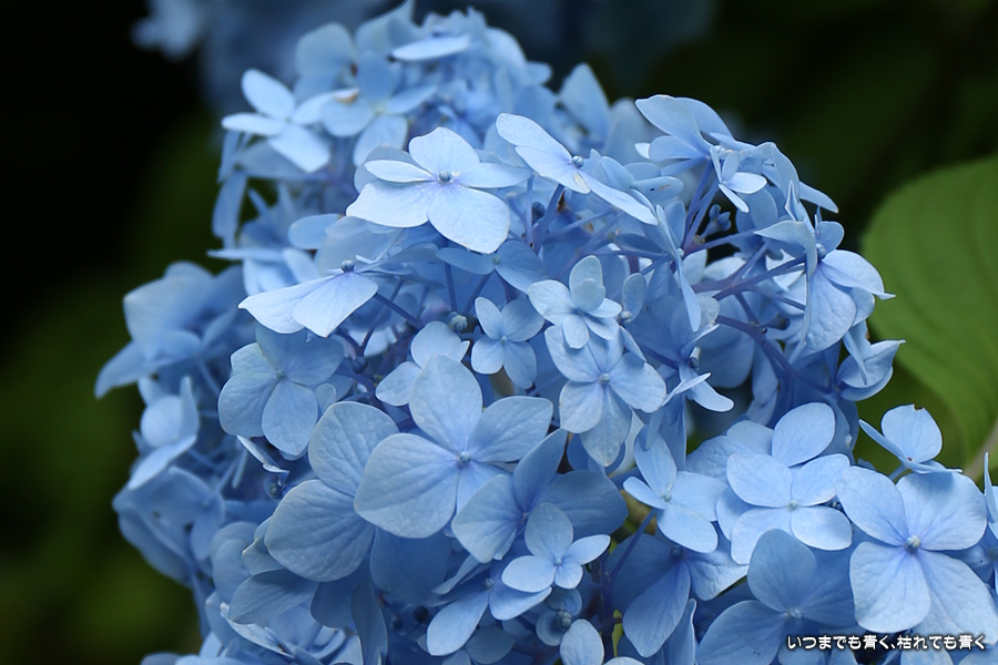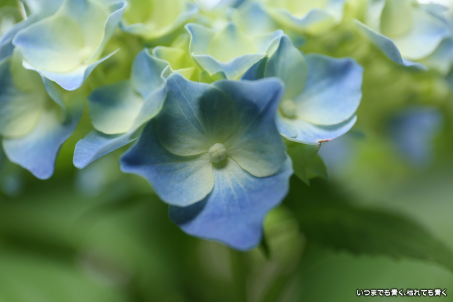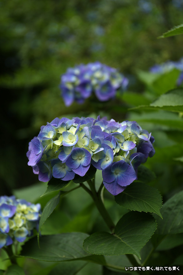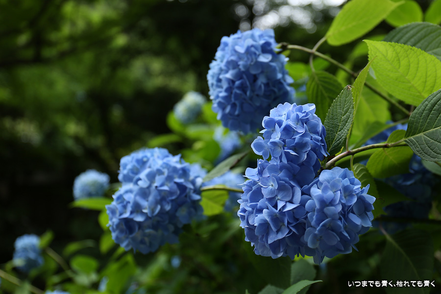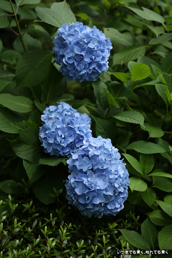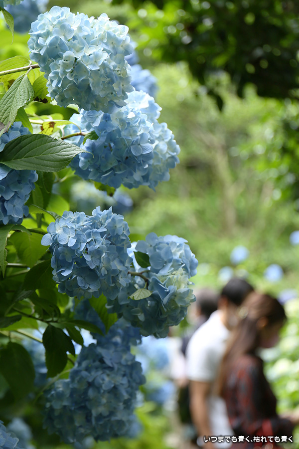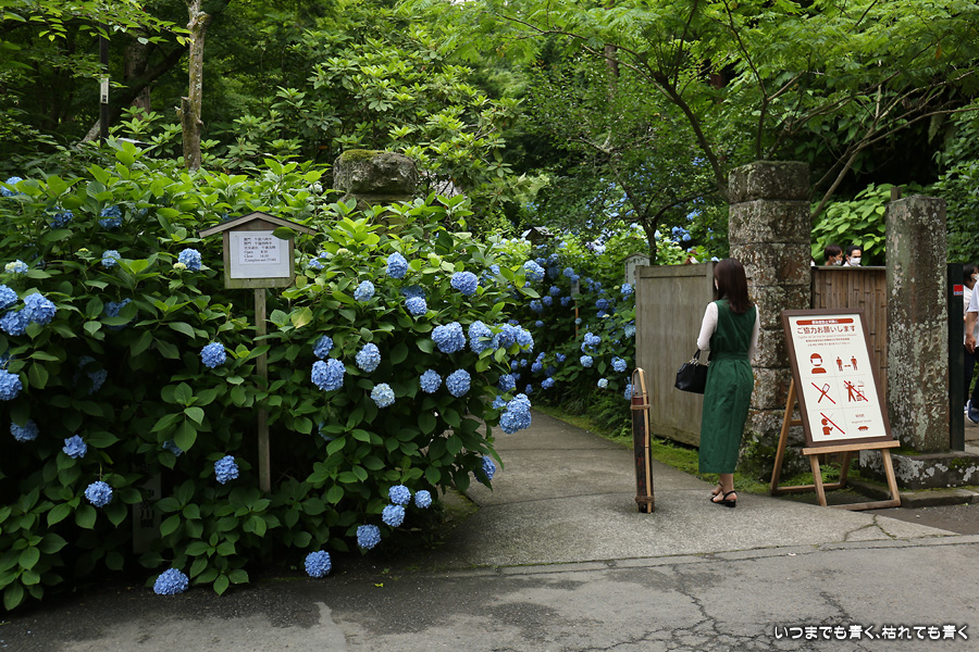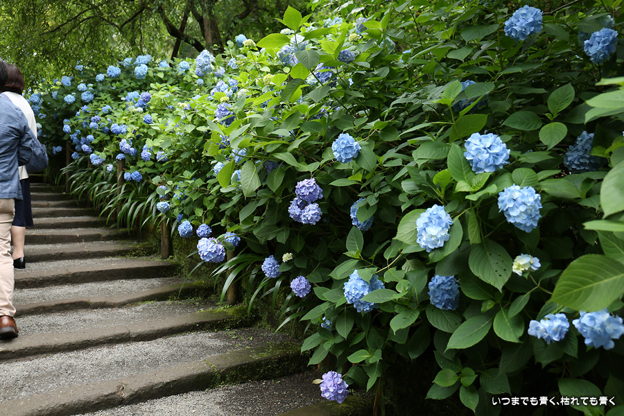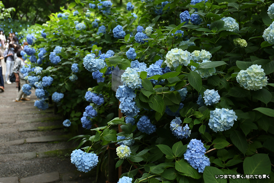 「ここは青い紫陽花ばかりだね」という声がたまに聞こえてきますが、明月院と言えば明月院ブルーの紫陽花です。今年は早めに来たせいか紫陽花の花が若々しくて美しいものばかりでした。明月院ならではの構図で撮影しようと心がけましたが、ひとつひとつの花が美しいので、ついアップで撮ってしまうことも多かったです。人が多くて人を入れない写真を撮るのは難しかったので、人を入れて撮影した写真が多くなりました。