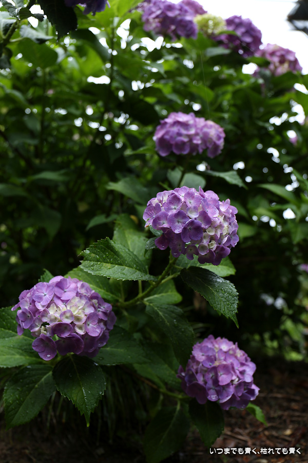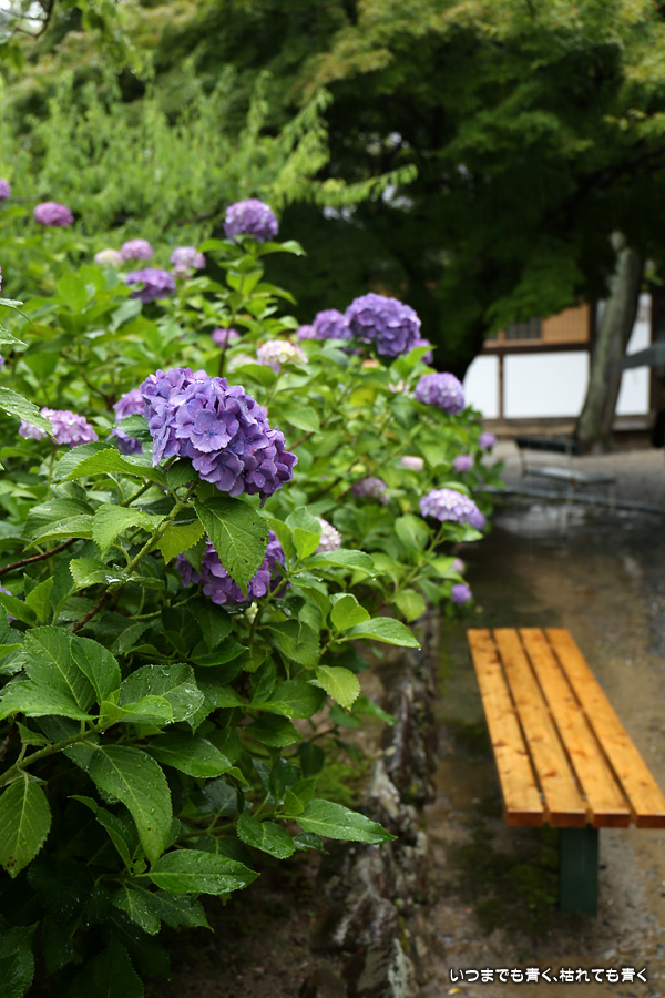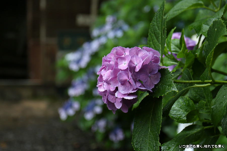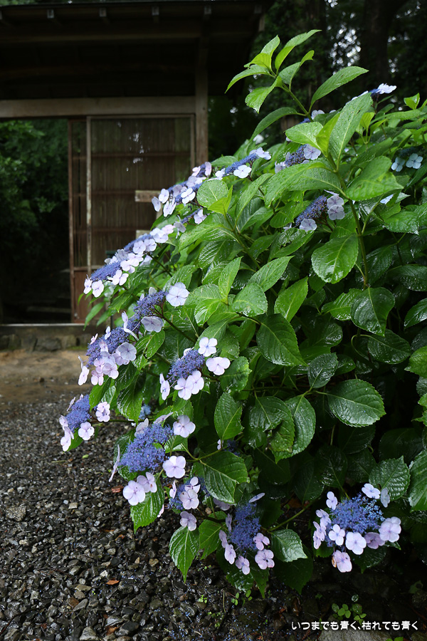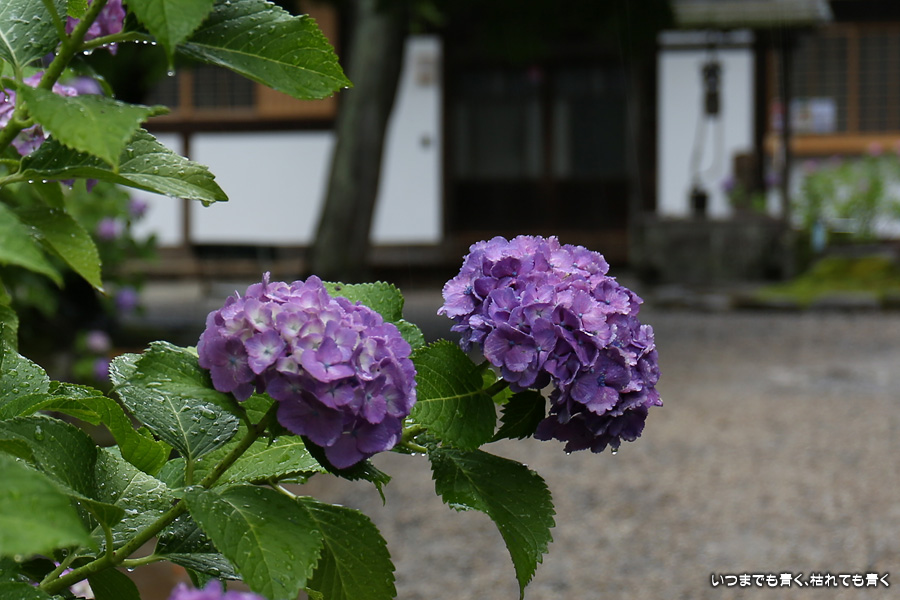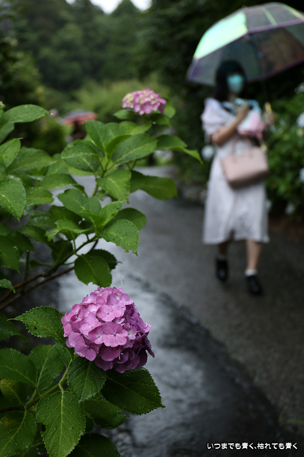 御裳神社を出るとすぐに雨が降り出して、本光寺に着いた頃は本降りになっていました。それでも駐車場に入る車の列で訪れる人は多いです。ここの紫陽花は毎年期待を裏切らずいつも美しいですし、いろいろな構図を探すことができます。ただ、本降りの雨の中、傘をさしての撮影でしたので、手ぶれの写真が少なくなく難しい撮影でした。なお、昨年まで工事中だった本堂が3年がかりの改修を終えてきれいになっていました。そのかわりに今度は肖影堂が工事のシートで覆われていました。御朱印をいただくときに「いつ完成ですか?」と尋ねたら、肖影堂は完全な建替え工事なので4年かかるとのことでした。