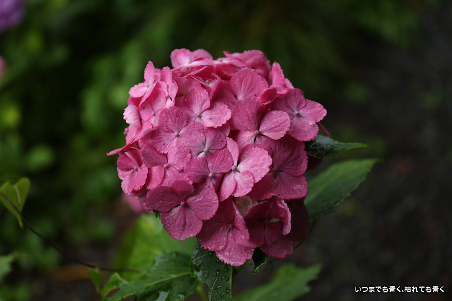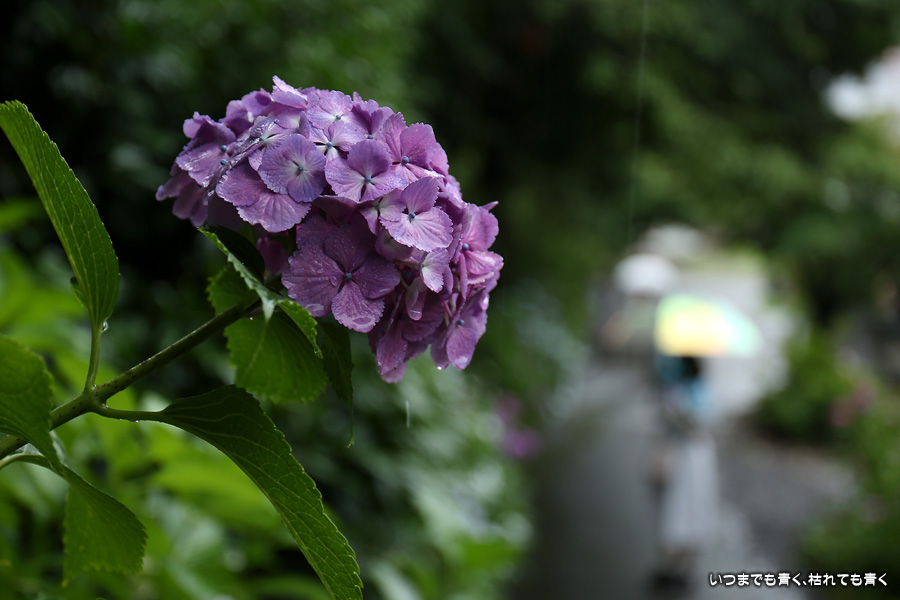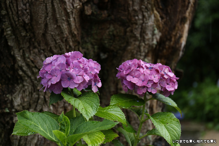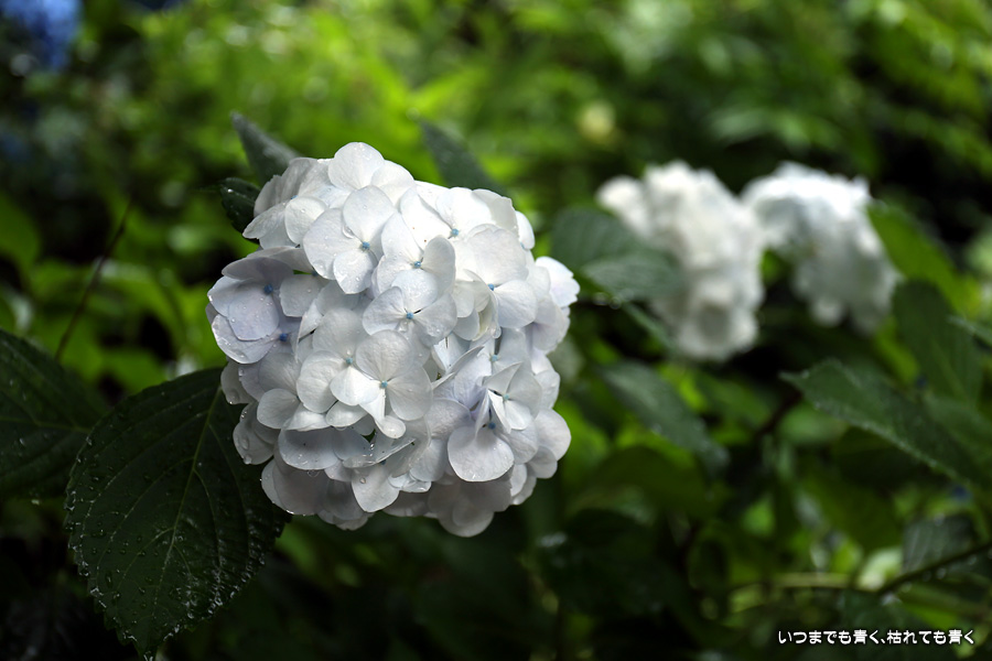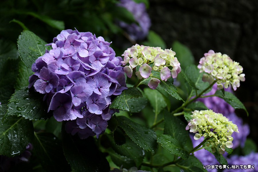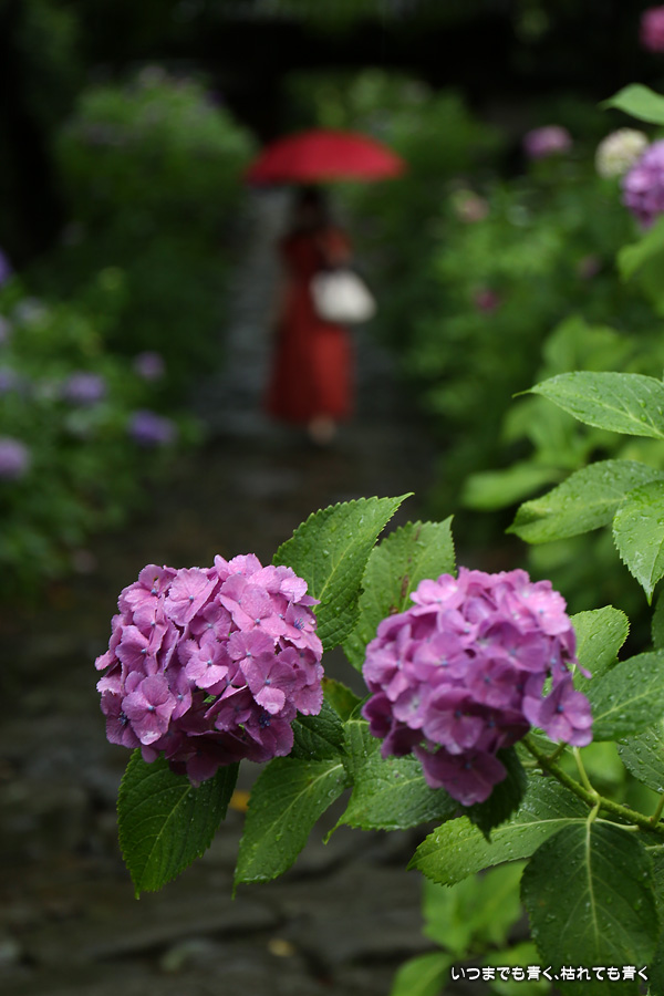 御裳神社を出るとすぐに雨が降り出して、本光寺に着いた頃は本降りになっていました。それでも駐車場に入る車の列で訪れる人は多いです。ここの紫陽花は毎年期待を裏切らずいつも美しいですし、いろいろな構図を探すことができます。ただ、本降りの雨の中、傘をさしての撮影でしたので、手ぶれの写真が少なくなく難しい撮影でした。なお、昨年まで工事中だった本堂が3年がかりの改修を終えてきれいになっていました。そのかわりに今度は肖影堂が工事のシートで覆われていました。御朱印をいただくときに「いつ完成ですか?」と尋ねたら、肖影堂は完全な建替え工事なので4年かかるとのことでした。