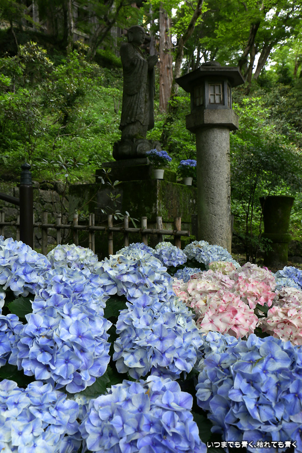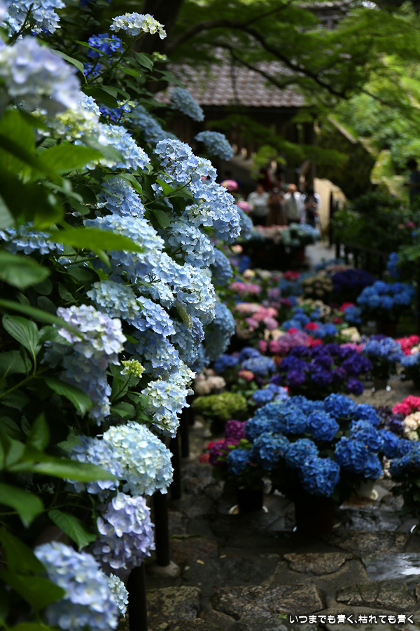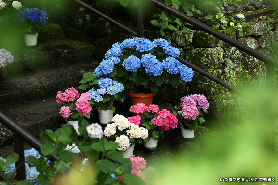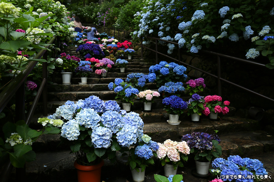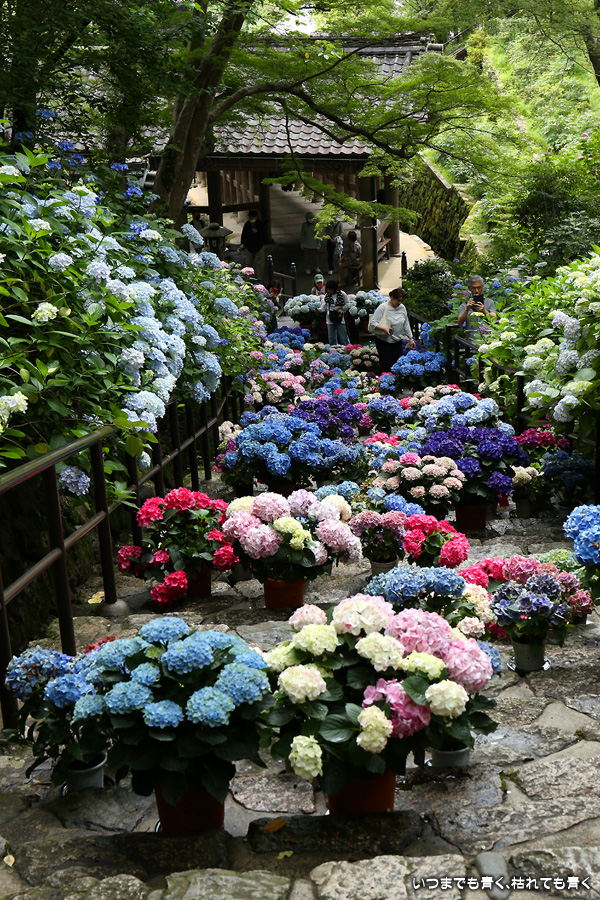 長谷寺の嵐の坂に紫陽花の鉢植えがびっしりと飾られています。大和三大観音である長谷寺、岡寺、壷阪寺でおこなわれている「あぢさゐ回廊」です。いろんな色の鮮やかな紫陽花はとれも美しいです。嵐の坂は立ち入り禁止にもなっておらず、この石段を鉢植えを避けて上ったり下りたりできます。写真を撮るには人が入って邪魔ですが、おかしな雰囲気になることも無く皆さん楽し気に写真を撮っていました。私も人を入れたり、じっと人がいなくなるのを待ったりと、のんびりと楽しみながら写真撮影をしました。岡寺と壷阪寺にも行きたいと思いましたが、それは来年の楽しみになりそうです。
