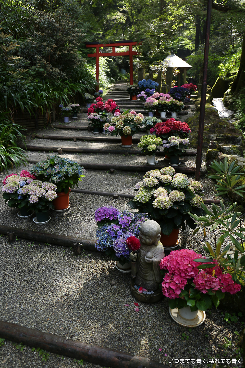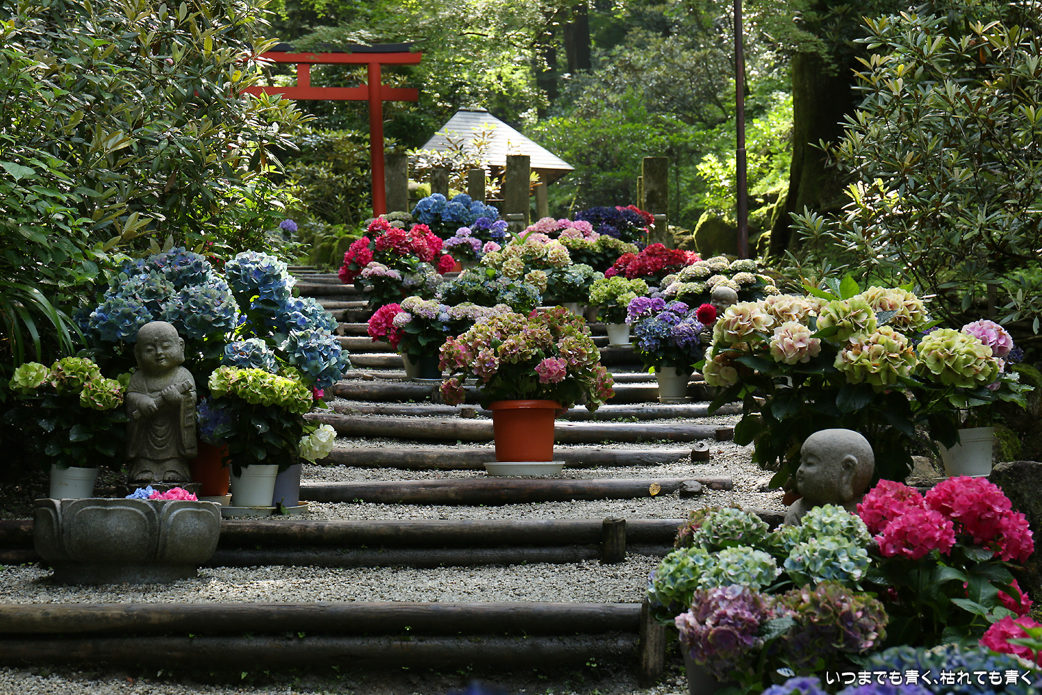 岡寺は石楠花の時期に来たことがありますが、今回は岡寺でおこなわれている大和三大観音「あぢさゐ回廊」を見にやってきました。鉢植えの紫陽花は、すでに変色しているのもあり、鉢植えの数も開催当初よりは少なくなっているのかなと思いました。ただ、訪れる人もまばらで、人のはいらない写真を撮るのは容易で、いろいろとアングルを変えて撮影を楽しみました。似通っている写真もありますが、微妙に変えて撮影しています。来年来る機会があれば、もう少し早めに訪れようと思います。「あぢさゐ回廊」の切り絵の御朱印は手に入れましたが、大和三大観音の御朱印を貼る台紙はすでに売り切れでした。なお、岡寺は紫陽花だけではなく、天竺牡丹(ダリア)も有名で、紫陽花と一緒に手水舎や鉢に浮かべられていて美しかったです。