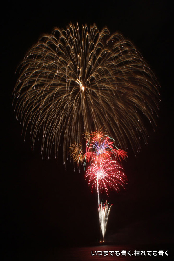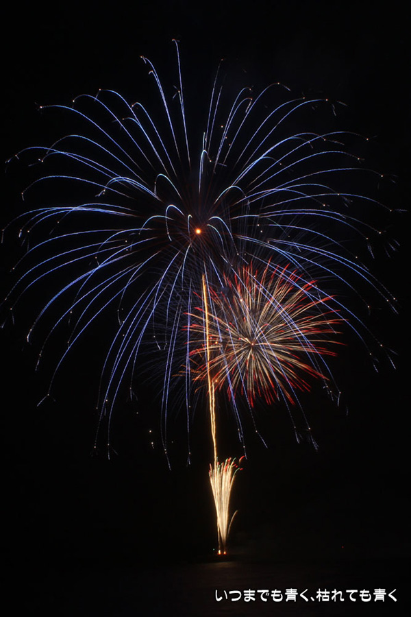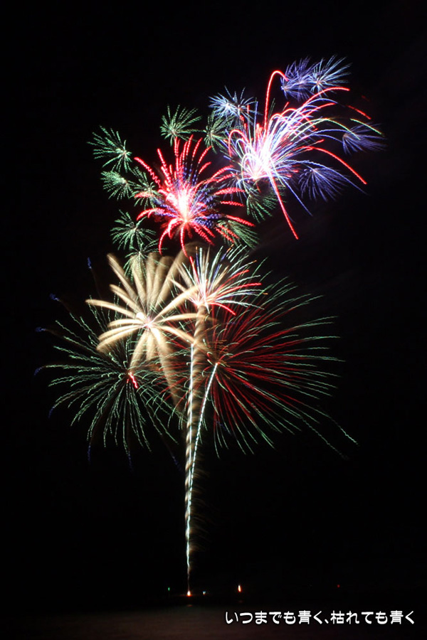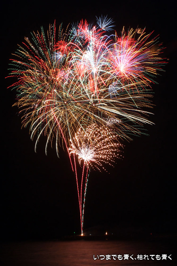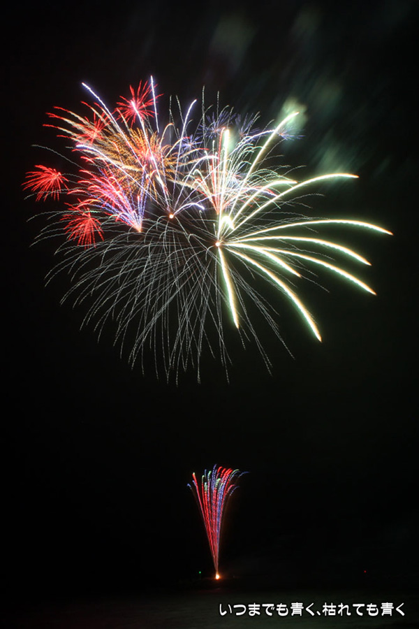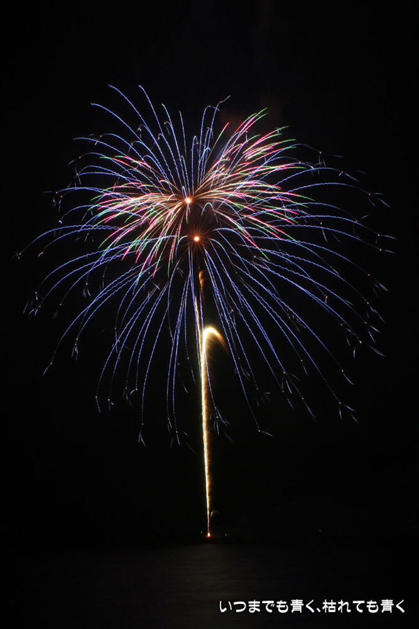 今年は昨年とは違って打ち上げ場所からかなり離れたところの海岸でタクシーを降ろされてしまい、海岸線をかなり歩く羽目になりました。それでも打ち上げ場所にあまり近づくことはできず、しかも湿気のある風が強く吹いていて、三脚は揺れるしレンズがすぐにベトベトになってしまうしで、まともに見ることができる写真はほんの一部しかありませんでした。特に風の影響は、花火の形もゆがめてしまいますし、微妙なカメラの揺れが花火の軌跡をミミズがはった跡のように乱します。なので掲載するのを迷っていたのですが、昨年の「サザンビーチちがさき花火大会」の写真よりは進歩はありそうかもと思い直して記録の意味も兼ねて掲載しておくことにしました。