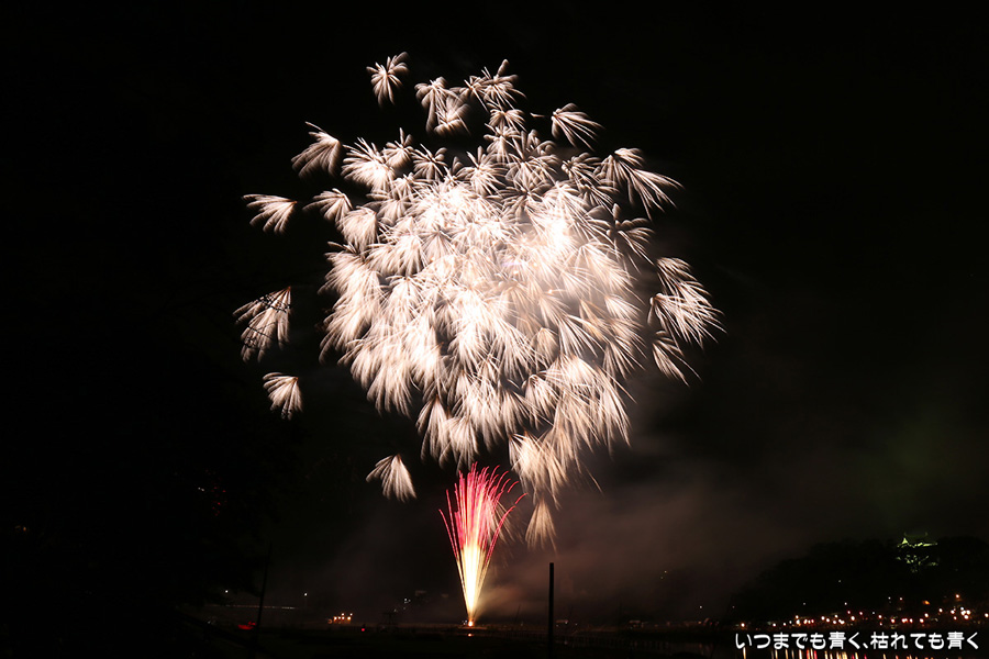 岡崎の花火は、人混みが嫌でいつも遠くから見るだけで近くでは見たことがなかったのですが、病気が判明したため行けるうちに一度は行っておこうと思って、風邪気味で体調イマイチでしたが無理して近くで撮影してきました。乙川河川敷に陣取ったのですが、矢作川河畔で打ち上げる花火は木で隠れて見えなかったものの、乙川河畔の打上花火や仕掛花火は目の前で見ることができ、迫力満点でした。やっぱり花火は近くで見るに限ります。先週の豊田市のおいでんまつりの花火よりも種類も内容も充実していたように感じました。ただ、写真撮影は近くよりも少し離れているほうが良いようです。岡崎城と一緒に撮ろうと思っていたのですがそれもあまり絵にならず、花火に近いため静止画にすると高さも感じられず、連続打ち上げが多いため単調な絵になったりとまた不満ばかりです。花火の写真としては、おいでんまつりの花火のほうがお気に入りは多かったです。近くでは静止画の美しさよりも動画の迫力と思いましたので、今回は動画も少し撮りましたので