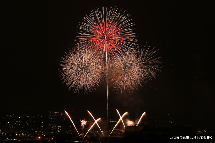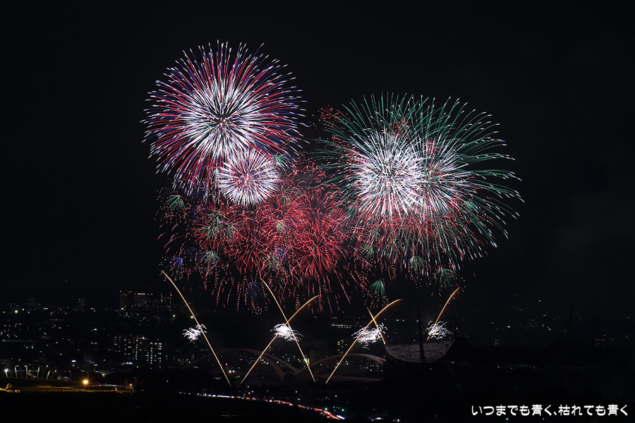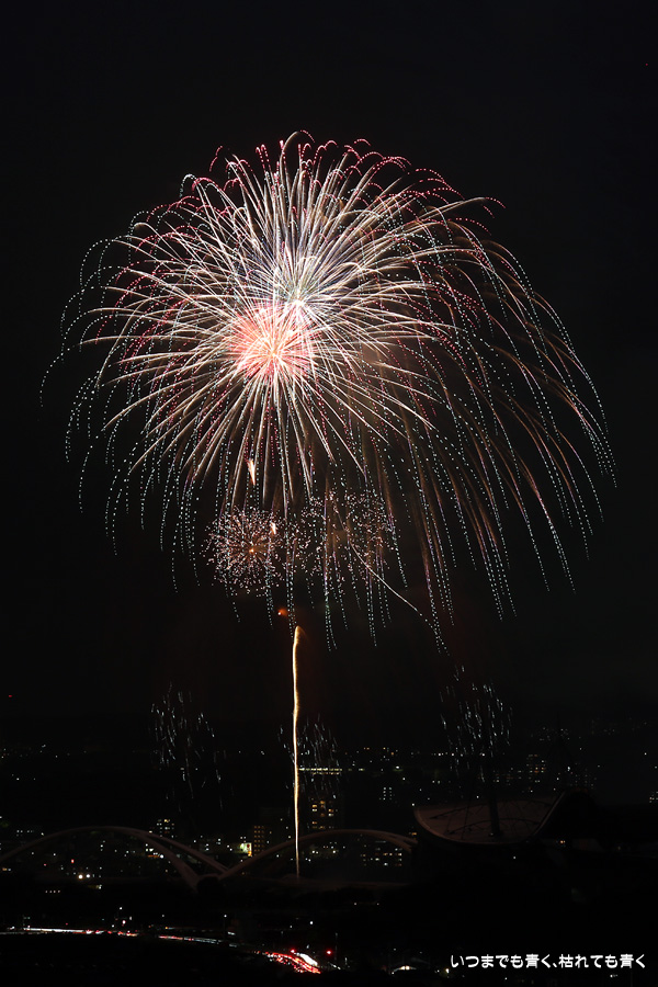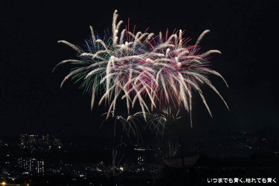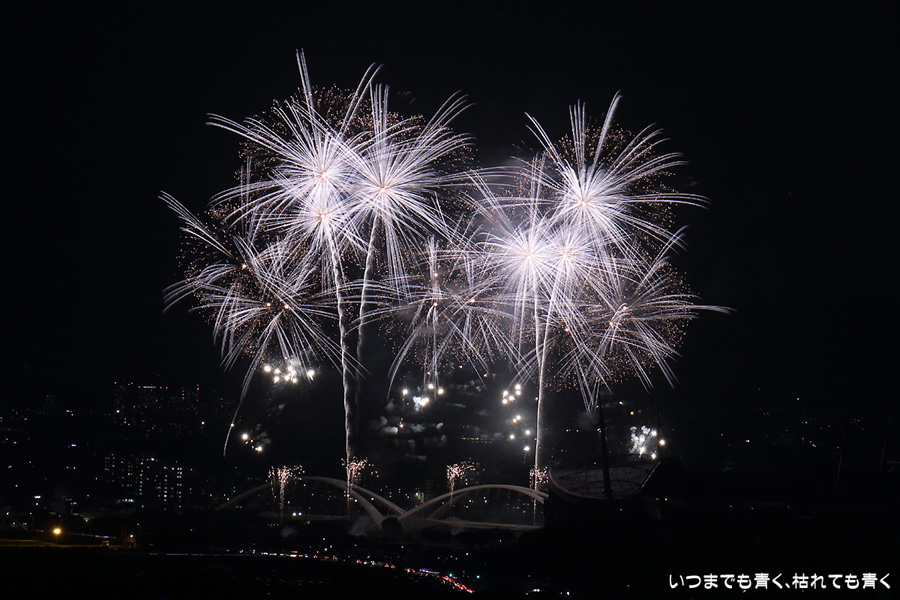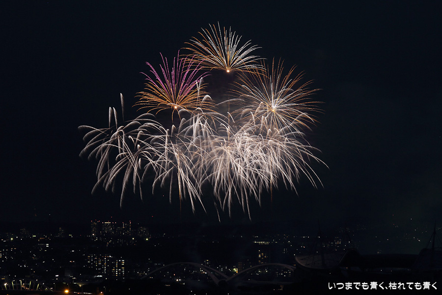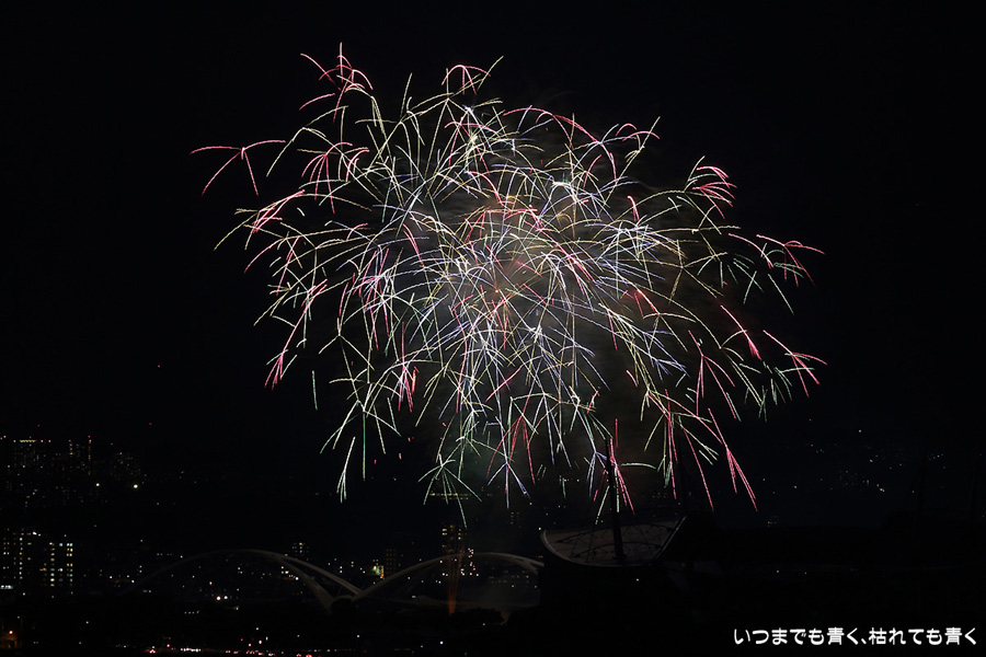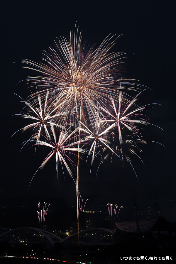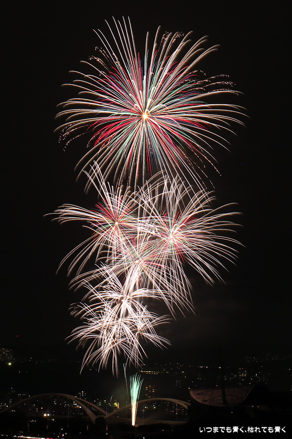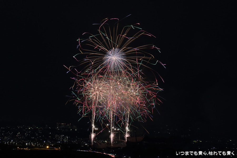 などあたらめて難しさを痛感しました。そんな状態でしたので、今回は面白い写真が少なかったように思います。花火自体も年々豪快さが乏しくなってきている感じもします。また、ここ3年は同じ場所からの撮影なので同じような写真ばかりになってきました。来年は撮影場所を変えたほうが良いかもしれませんが、他に良い場所を探すのも大変そうです。なお、重量級の望遠レンズで撮影した写真は三脚が耐え切れず、カメラが微妙に揺れて花火の軌跡が波打ってしまっているものがあります。細部には目を瞑ってご覧ください。
