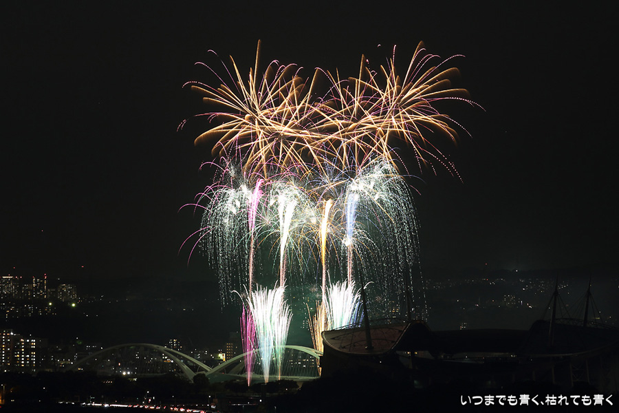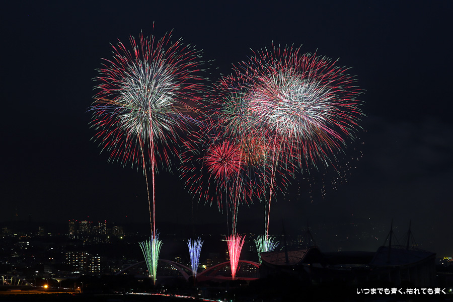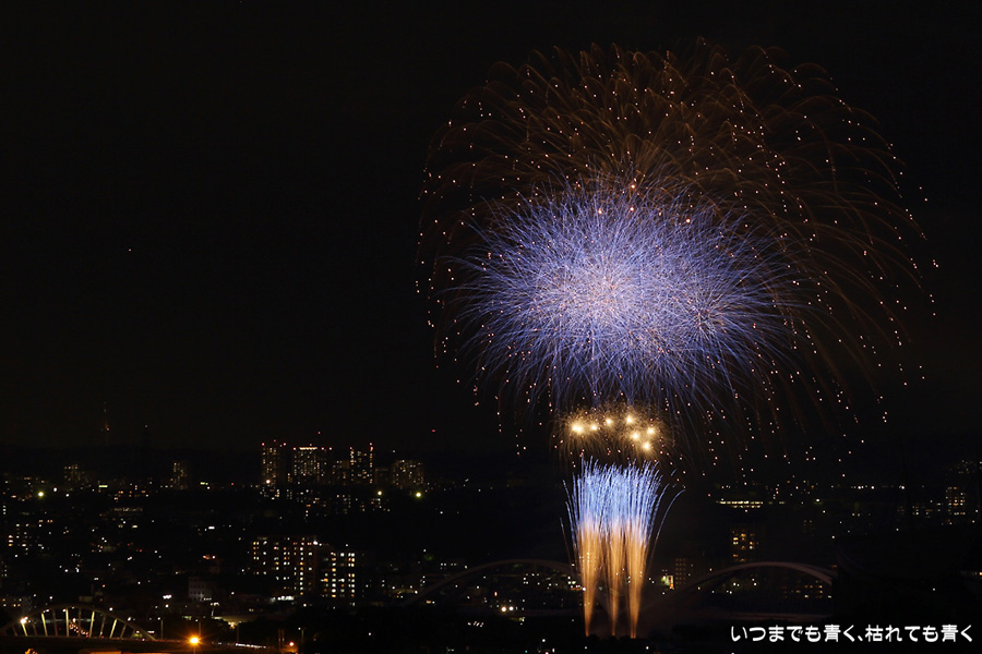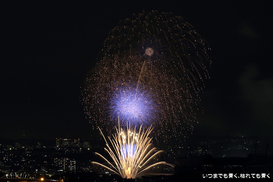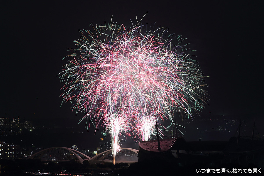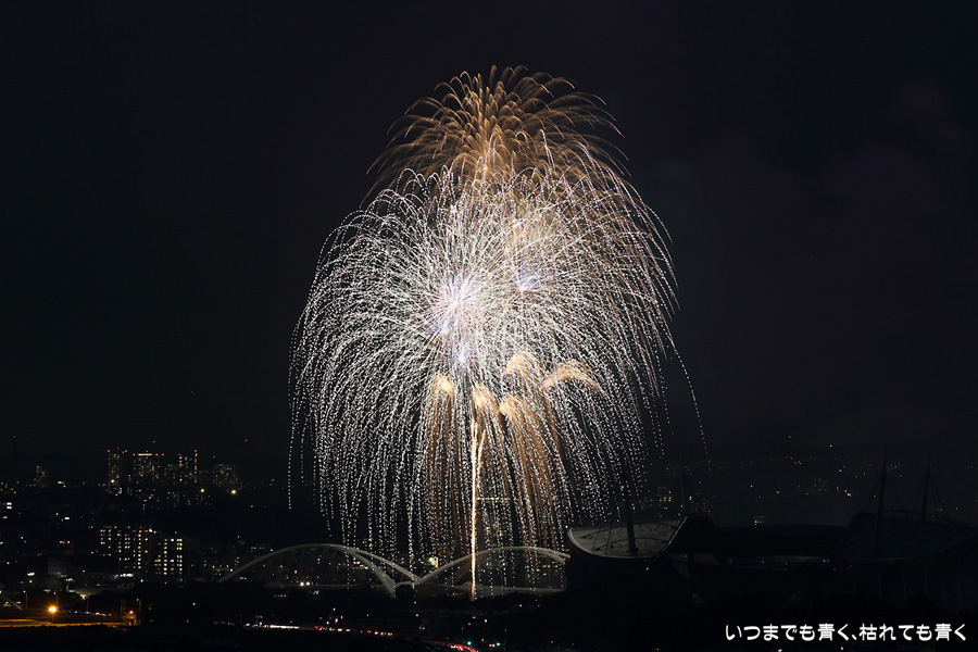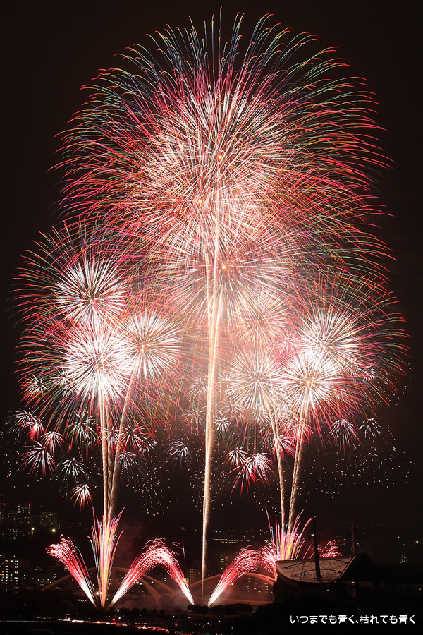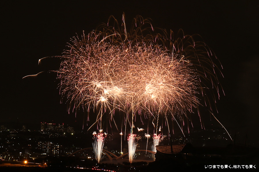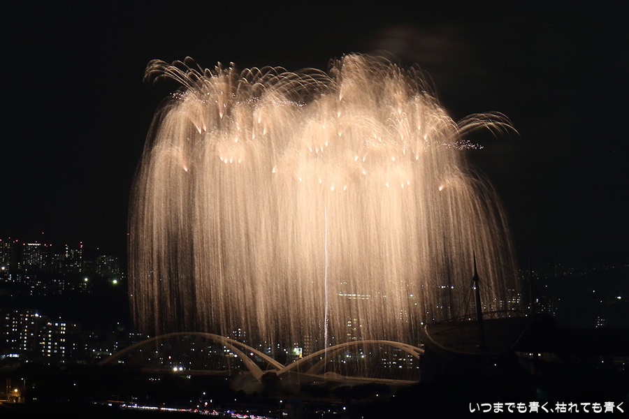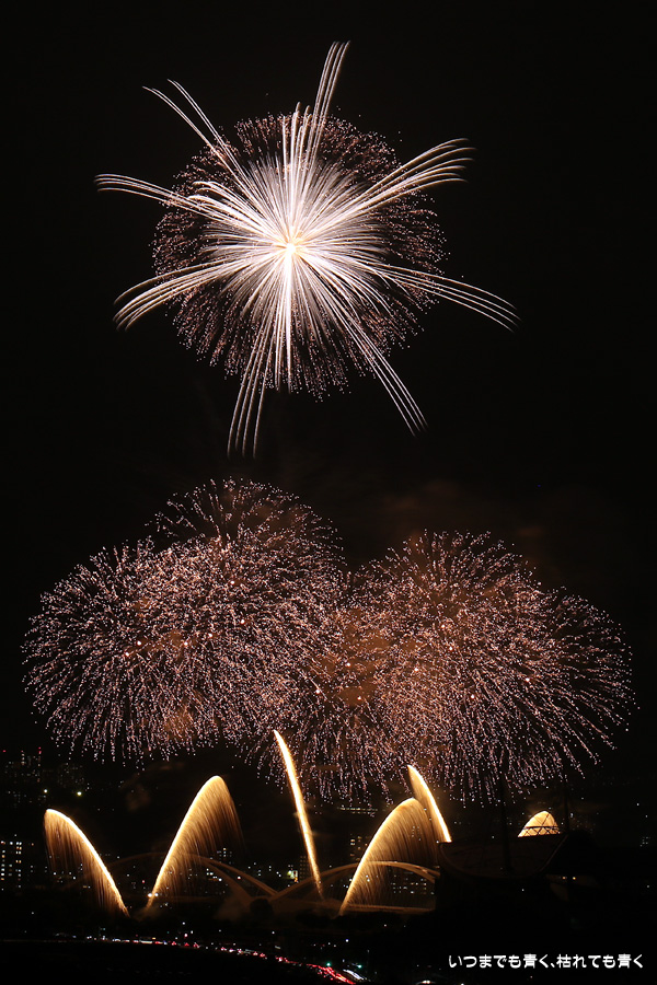 などあたらめて難しさを痛感しました。そんな状態でしたので、今回は面白い写真が少なかったように思います。花火自体も年々豪快さが乏しくなってきている感じもします。また、ここ3年は同じ場所からの撮影なので同じような写真ばかりになってきました。来年は撮影場所を変えたほうが良いかもしれませんが、他に良い場所を探すのも大変そうです。なお、重量級の望遠レンズで撮影した写真は三脚が耐え切れず、カメラが微妙に揺れて花火の軌跡が波打ってしまっているものがあります。細部には目を瞑ってご覧ください。