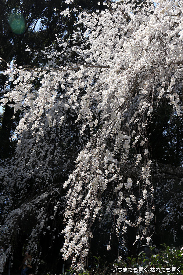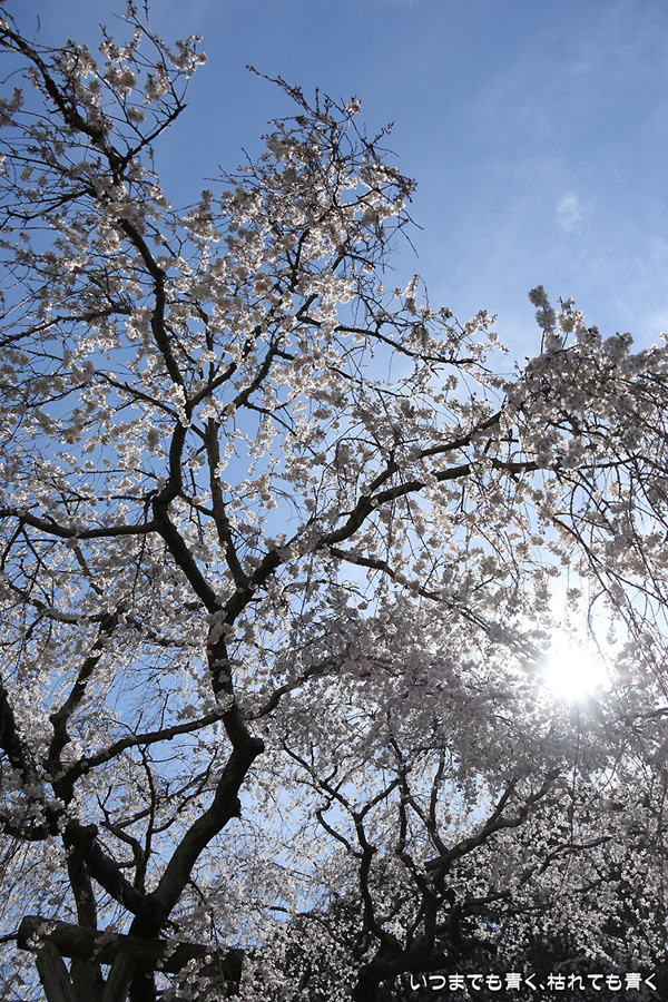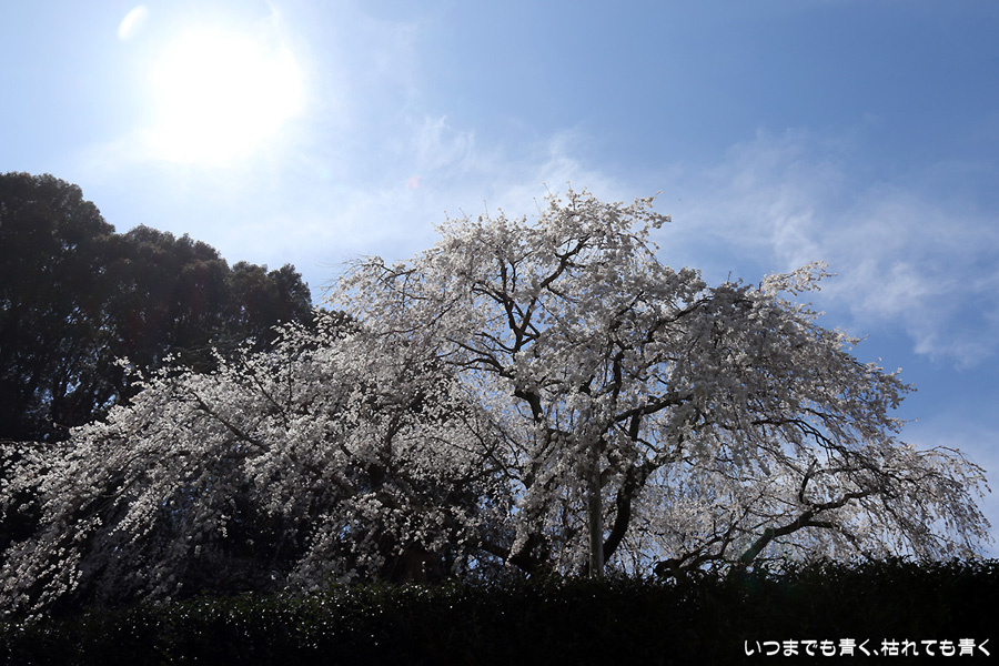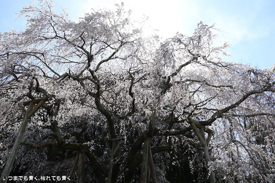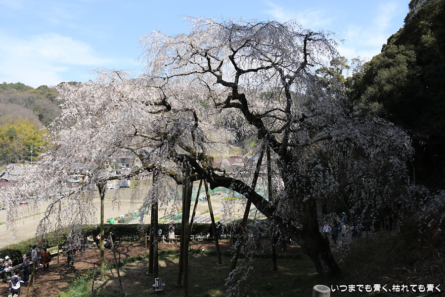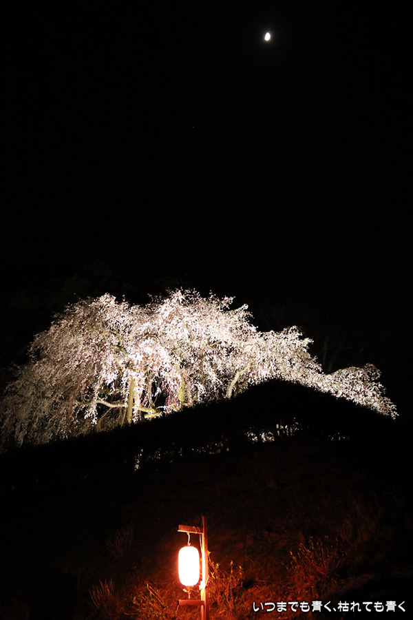 1300年ほど前に持統天皇が村積山行幸の際にお手植えされたと伝えられ、天然記念物に指定されているしだれ桜です。今日はちょうど見ごろでたくさんの人が集まっていました。ライトアップも見たくて夜にも行きましたが、昼よりも存在感がありました。三脚を据えて撮影している人が多かったですが、私は時間もなかったので手持ち撮影。おかげでピントのあまい(手ブレとも言います)写真ばかりになってしまいました。