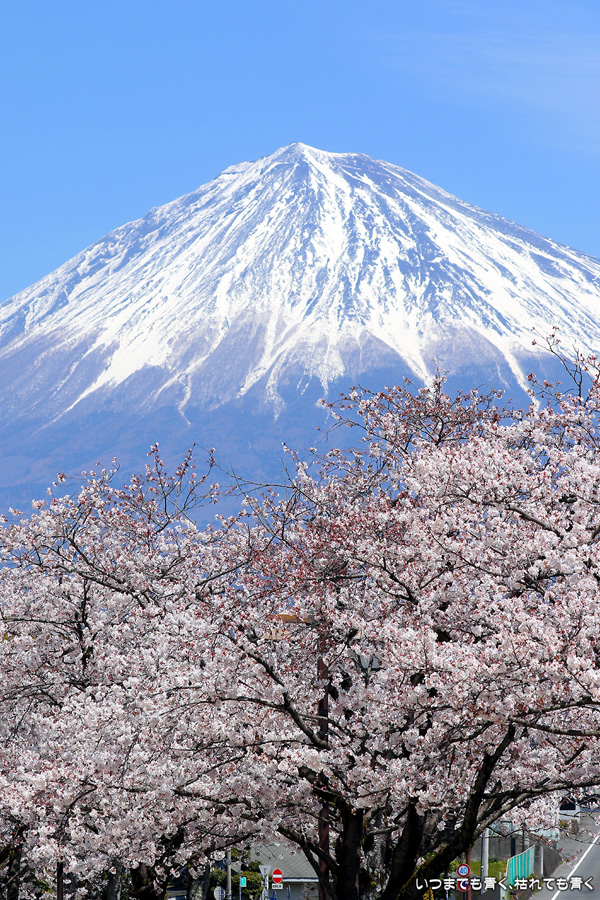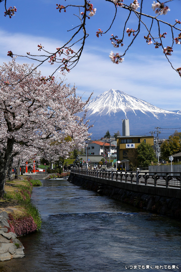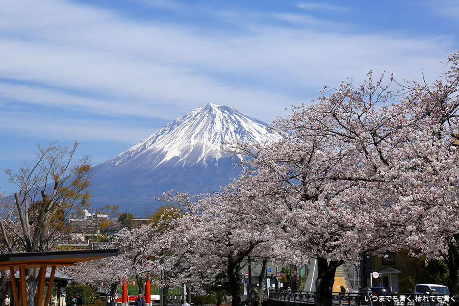 2019年4月5日に訪れた、富士山本宮浅間大社の横にある神田川ふれあい広場から撮影した富士山と桜の写真です。