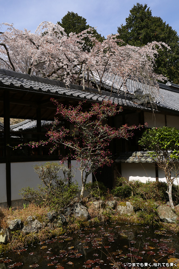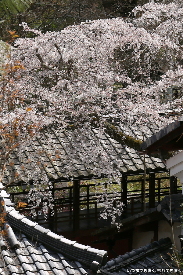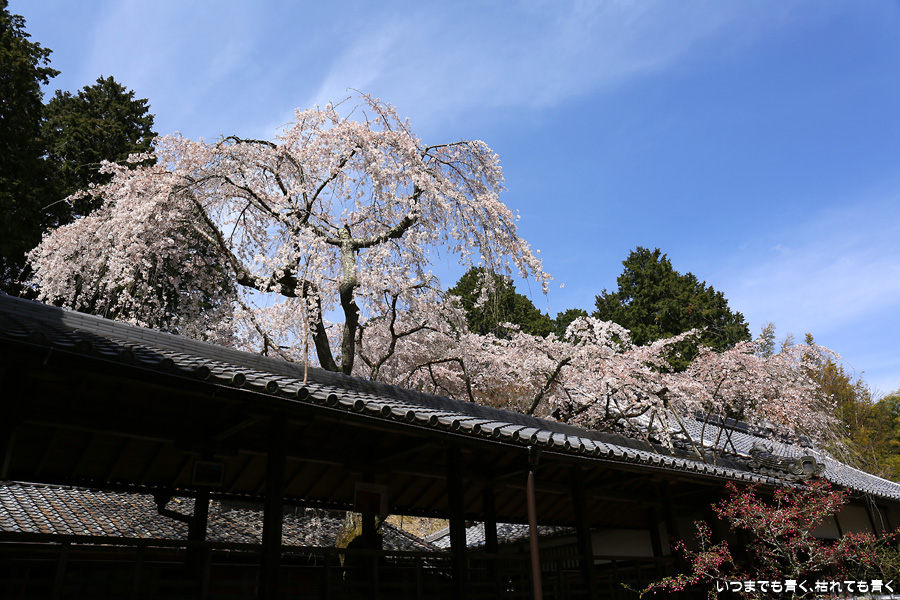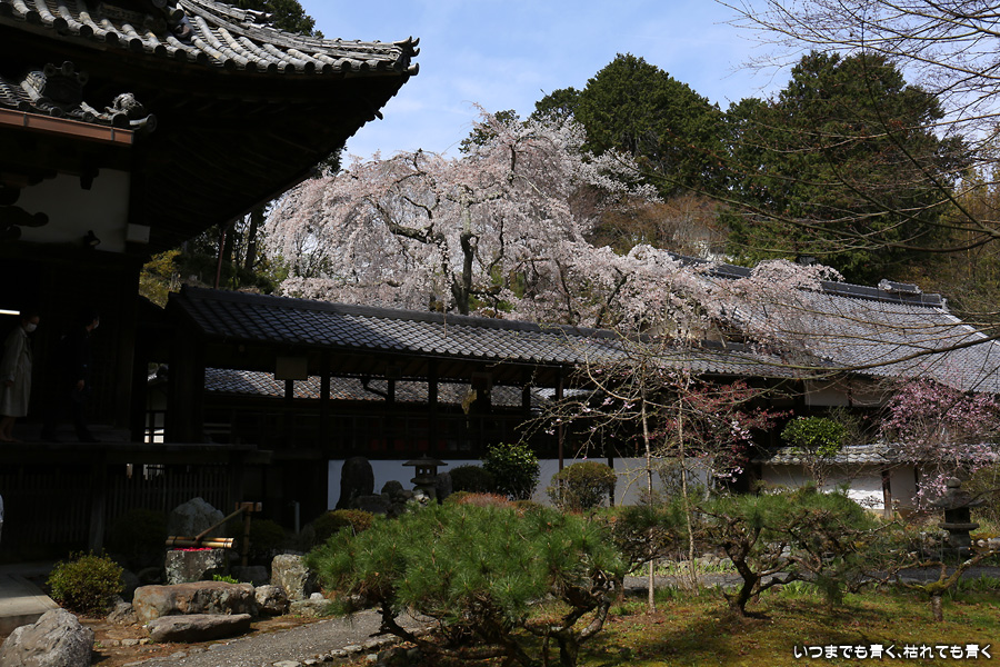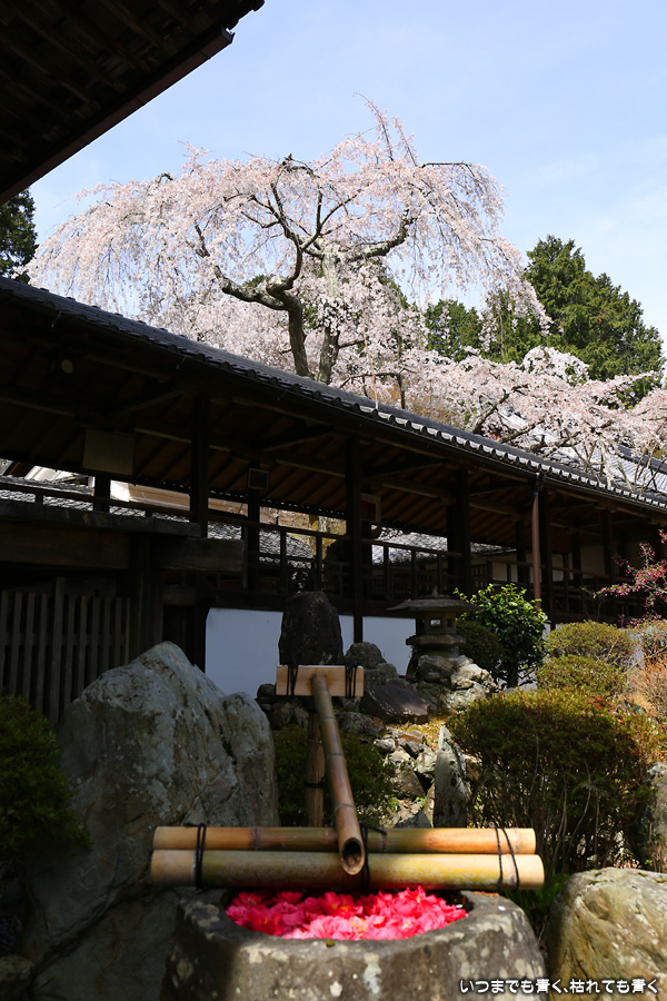 十輪寺は、昨年秋に紅葉を愛でに初めてきたお寺で、中庭のしだれ桜の咲いた光景を見たいと思って訪れました。すでに散り始めていましたが、まだ見頃で楽しめました。中からの写真は明暗の差が大きく、スマホならば美しく撮れますが一眼レフではあとでの現像作業が必須の悪条件でした。掲載した写真のうち、一枚はスマホで撮影した写真です。